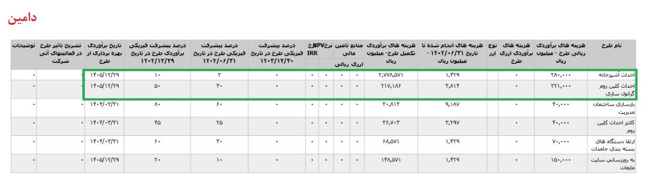 * احداث کلین روم گرانول سازی، با هزینه ی برآوردی تکمیل طرح معادل 22 میلیارد تومان که تاریخ برآوردی بهره برداری از طرح اسفند1405 اعلام شده است