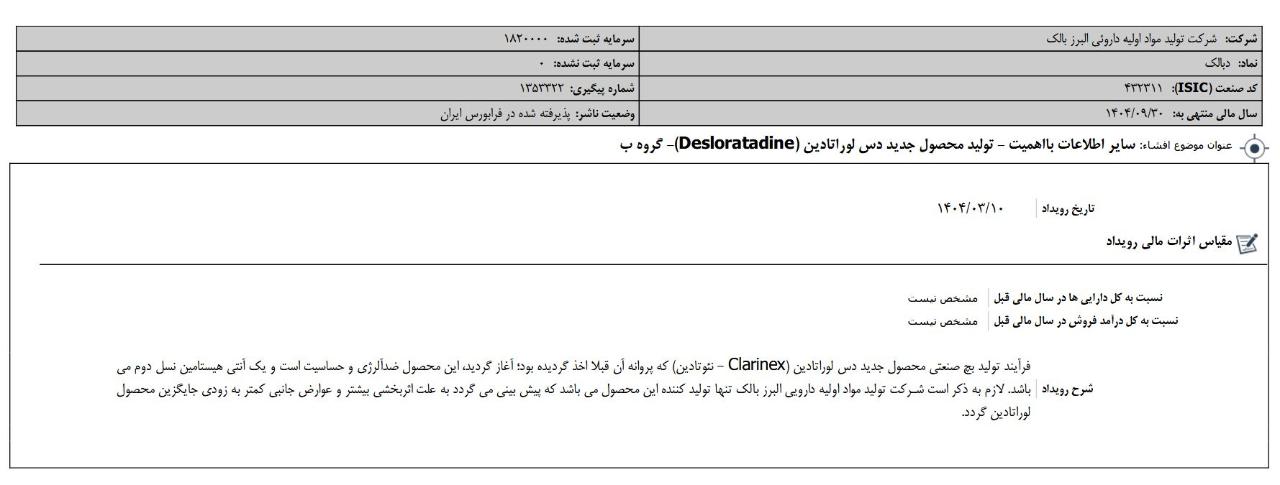 افشای اطلاعات بااهمیت،تولید محصول جديد دس لوراتادین Desloratadine- گروه ب