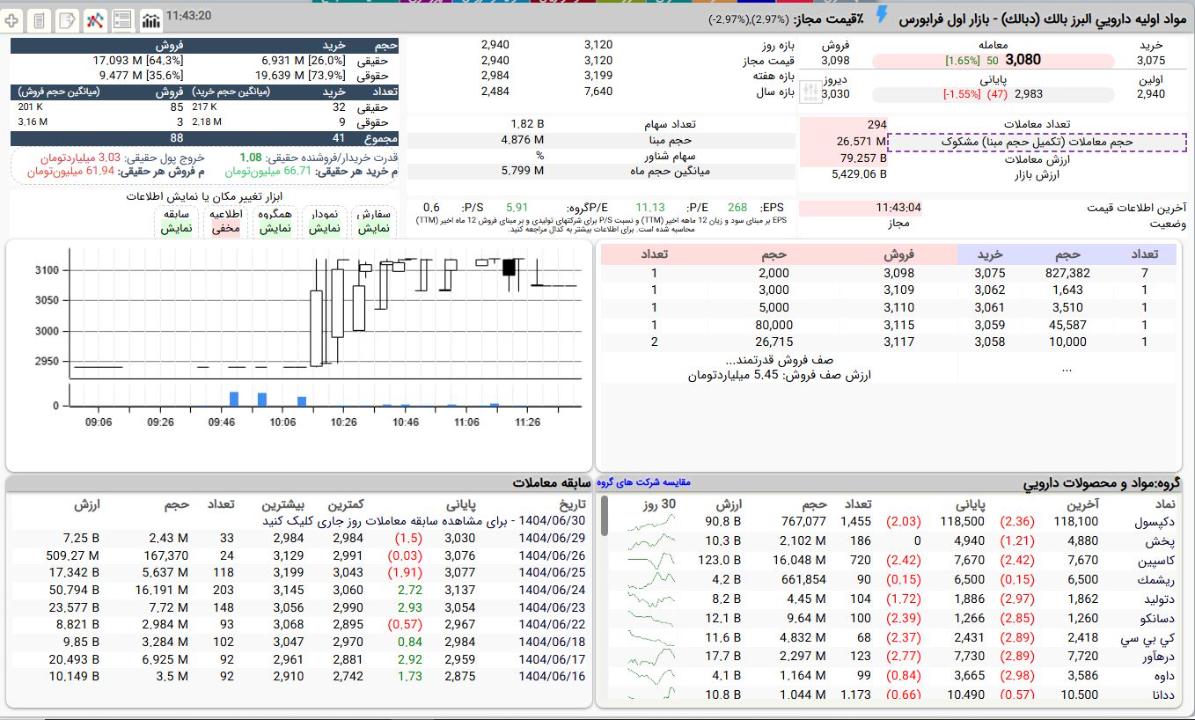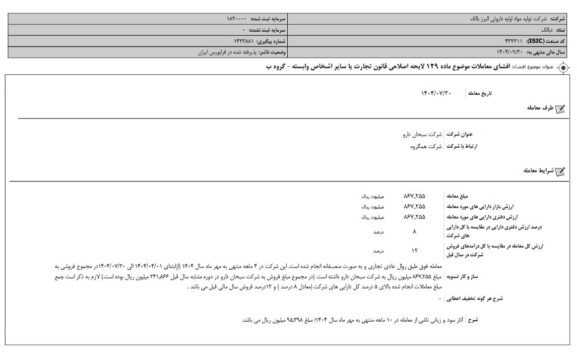 مجمع عمومی عادی سالیانه شرکت توليد مواد اوليه داروئي البرز بالک روز 4 خرداد 1404 با حضور 49.92 درصد سهامداران برگزار شد و با تصویب مجمع از سود 124 ریالی ایجاد شده مبلغ 13 ریال بین سهامداران تقسیم شد.
