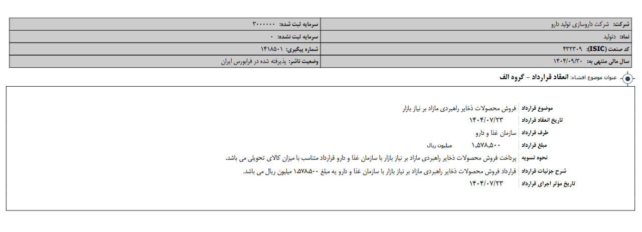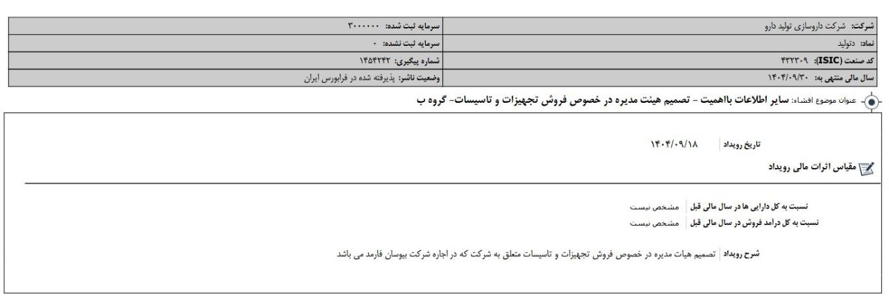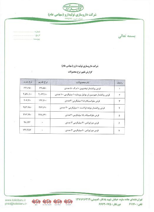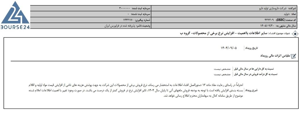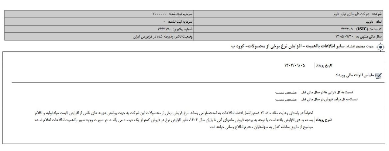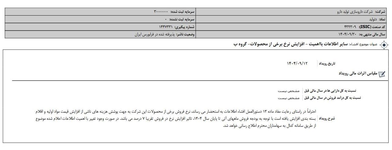 #دتولید احتراماً در راستای رعایت مفاد ماده 13 دستورالعمل افشاء اطلاعات به استحضار می رساند، نرخ فروش برخی از محصولات این شرکت به جهت پوشش هزینه های ناشی از افزایش قیمت مواد اولیه و اقلام بسته بندی افزایش یافته است با توجه به بودجه فروش ماههای آتی تا پایان سال 1404، تاثیر افزایش نرخ در فروش کمتر از یک درصد می باشد. در صورت وجود تغییر با اهمیت اطلاعات اعلام شده موضوع از طریق سامانه کدال به سهامداران محترم اطلاع رسانی خواهد شد.