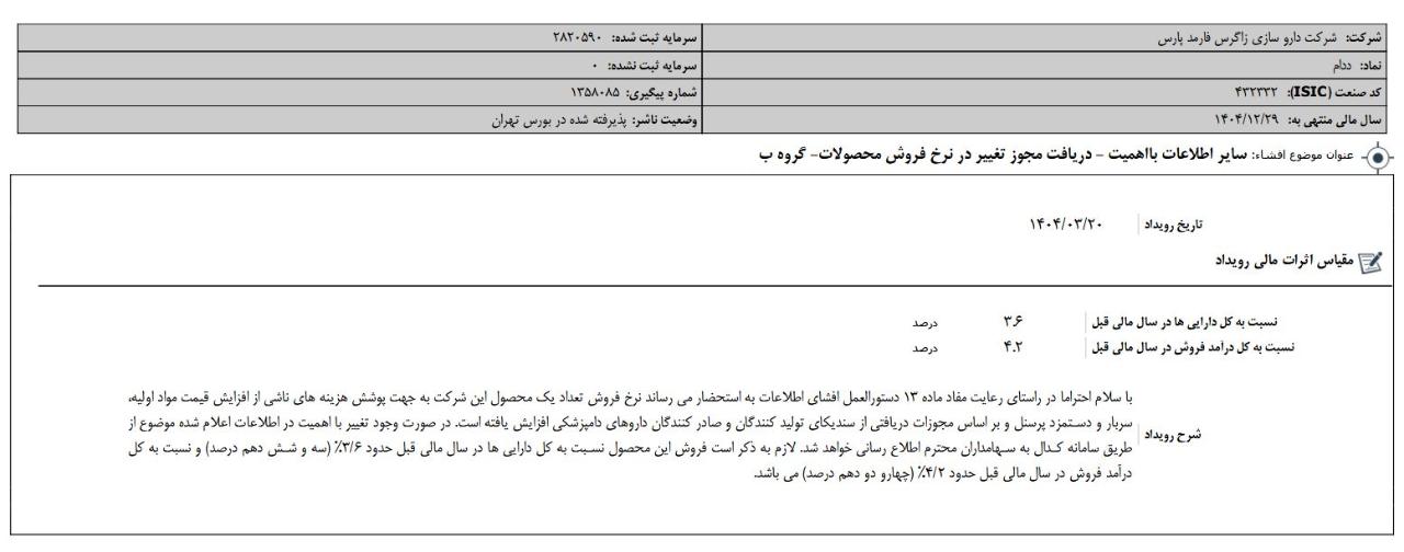 افشای اطلاعات بااهمیت،دریافت مجوز تغییر در نرخ فروش محصولات- گروه ب