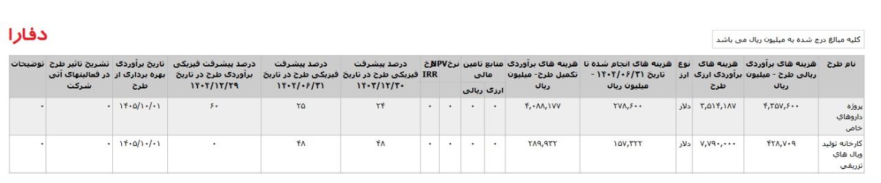 * پروژه کارخانه توليد ويال هاي تزريقي ، با هزینه ی برآوردی تکمیل طرح معادل 29 میلیارد تومان که تاریخ برآوردی بهره برداری از طرح دی 1405 اعلام شده است.