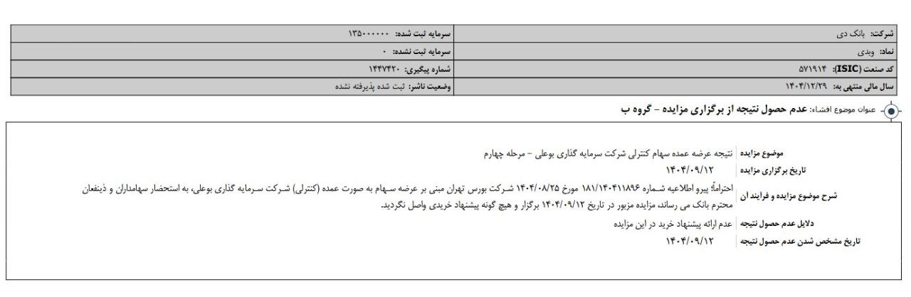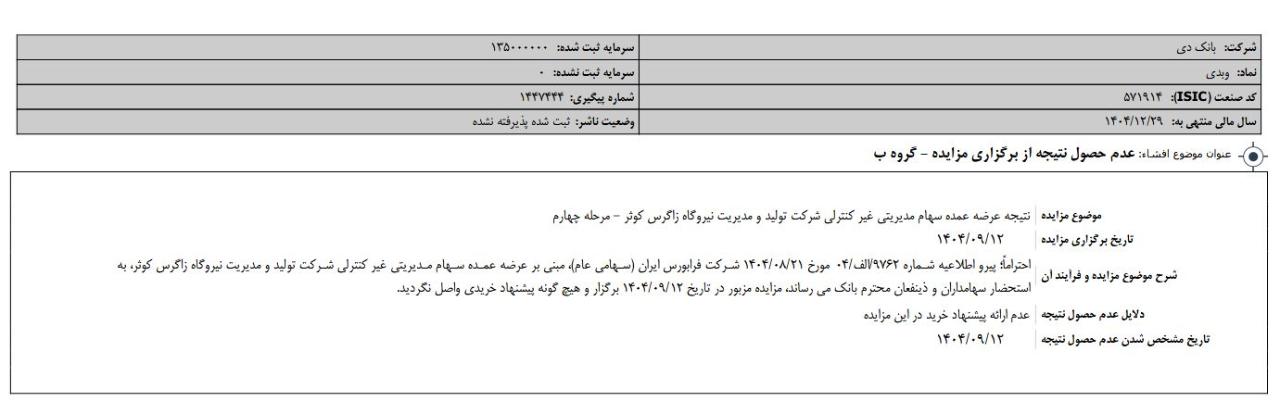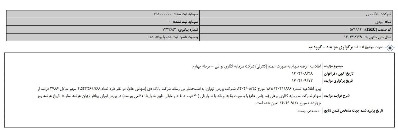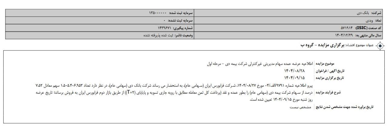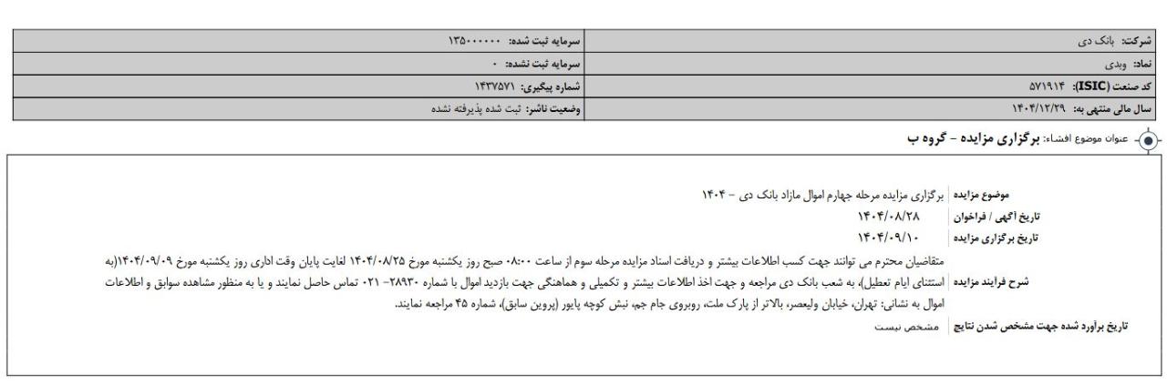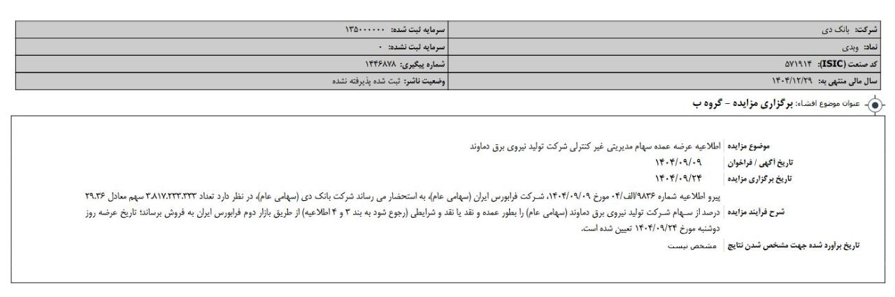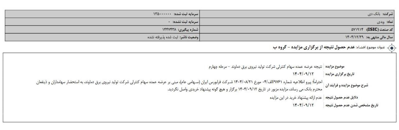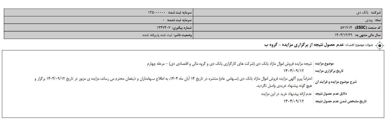 افشای اطلاعات بااهمیت،نتیجه مزایده مرحله سوم اموال مازاد بانک دی- گروه ب