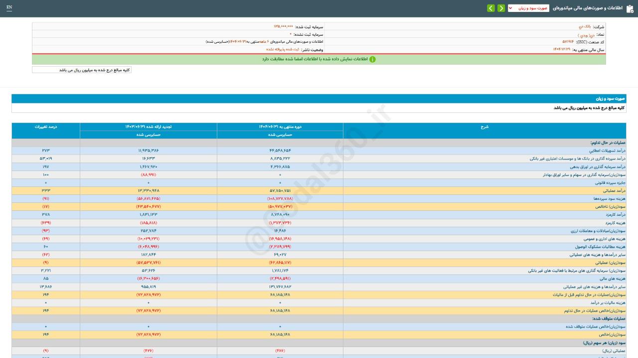اطلاعات و #صورت‌های_مالی_میاندوره‌ای #دوره_6_ماهه منتهی به 14040631 حسابرسی شده شرکت #بانک_دی