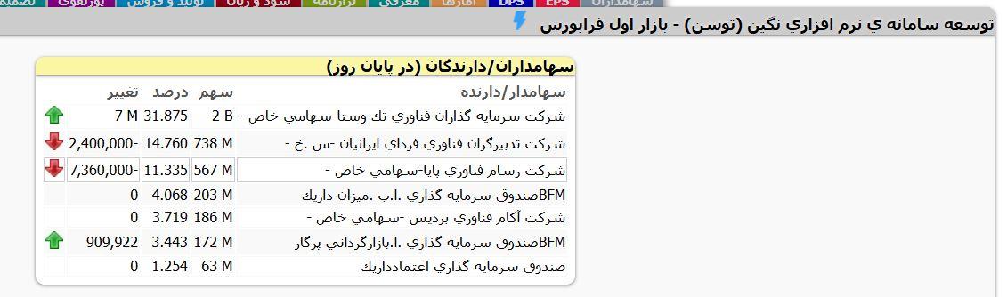 در ضمن در بازار عادی شركت تدبيرگران فناوري فرداي ايرانيان اقدام به فروش 2.4 میلیون سهم نمود.