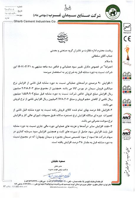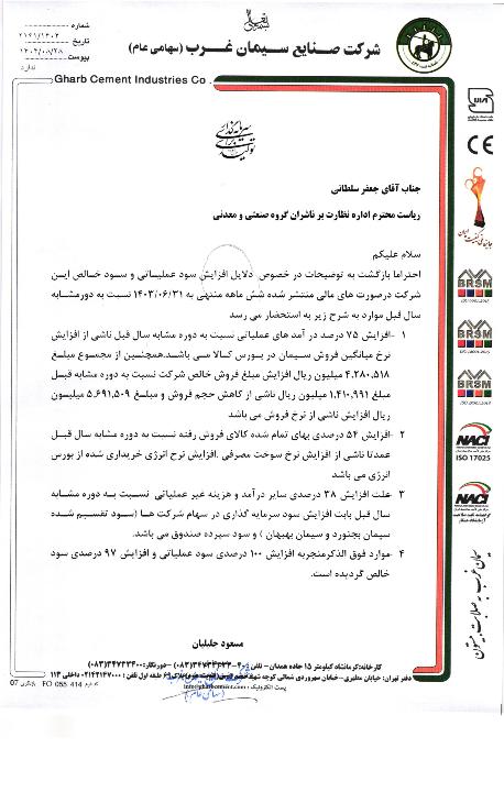 منتشر شده در اطلاعات و صورتهای مالی میاندوره ای دوره 6 ماهه منتهی به 1404.06.31 حسابرسی نشده ، تاریخ انتشار در کدال 1404.07.30