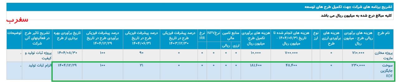*سوخت جايگزين RDF ،با هزینه ی برآوردی تکمیل طرح معادل 18 میلیارد تومان که تاریخ برآوردی بهره برداری از طرح اسفند 1404 اعلام شده است.