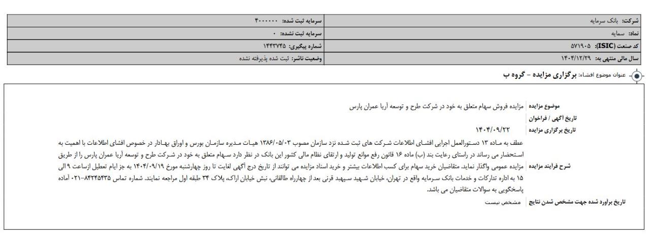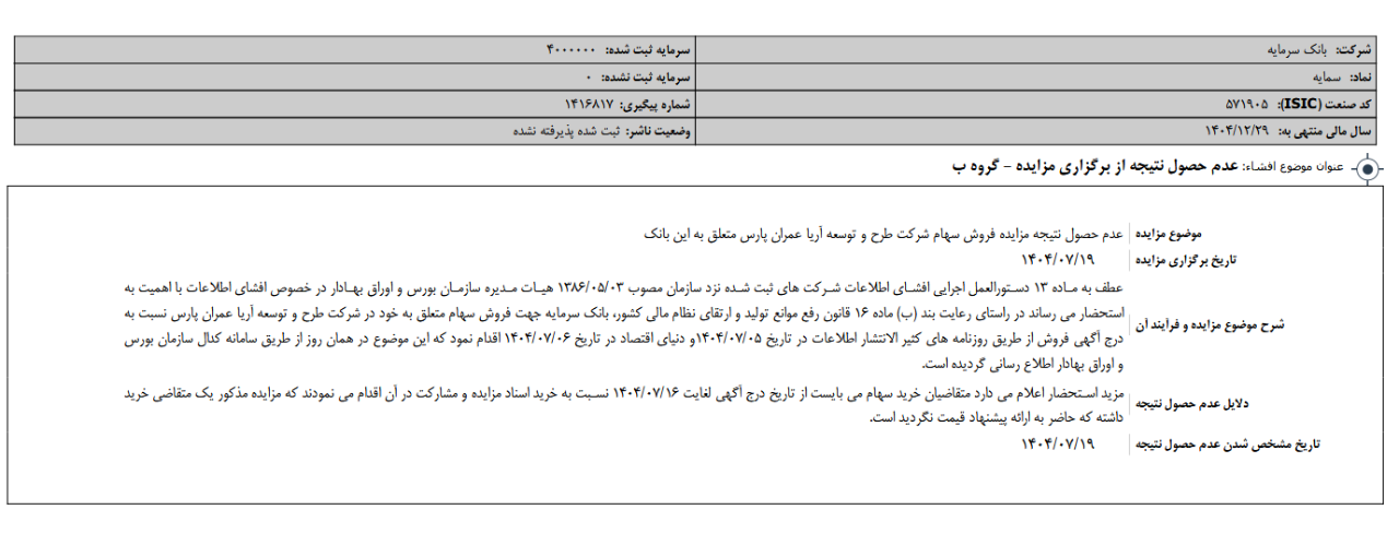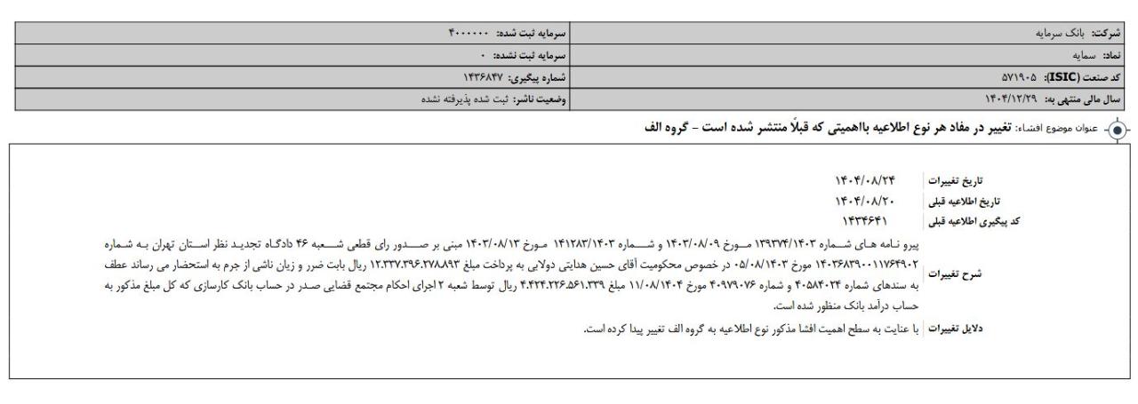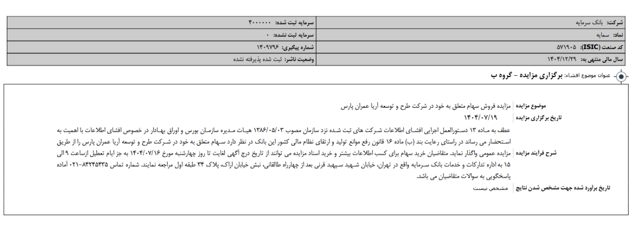 مجمع عمومی عادی سالیانه شرکت بانک سرمایه روز 17 شهریور 1404 با حضور 83.97 درصد سهامداران برگزار شد و با تصویب مجمع از آنجائیکه در سال مالی به ازای هر سهم 23311 ریال زیان شناسایی کرده بود سودی بین سهامداران تقسیم نشد.