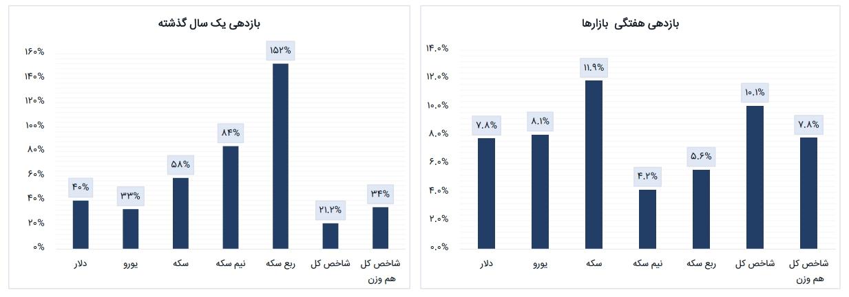 • هفته گذشته تمامی بازارها بازدهی بالای 5درصد را ثبت کردند که به ترتیب #سکه_امامی و #شاخص_کل #بورس بهترین عملکرد را در این میان داشته اند.