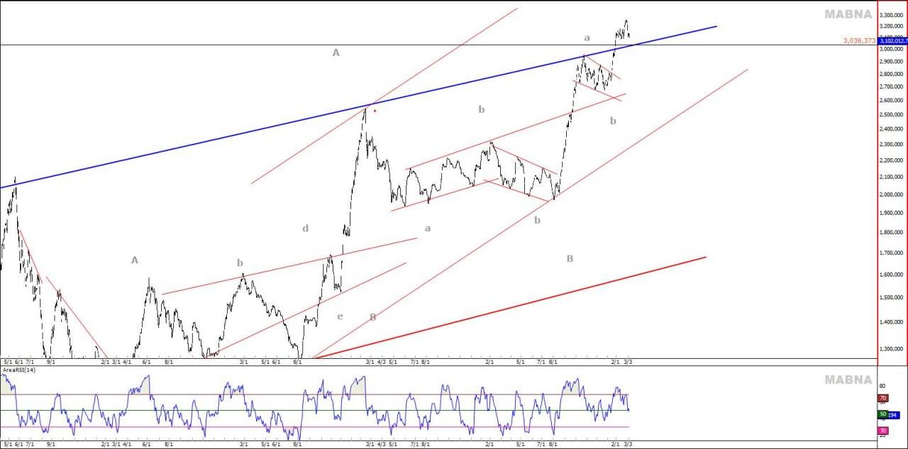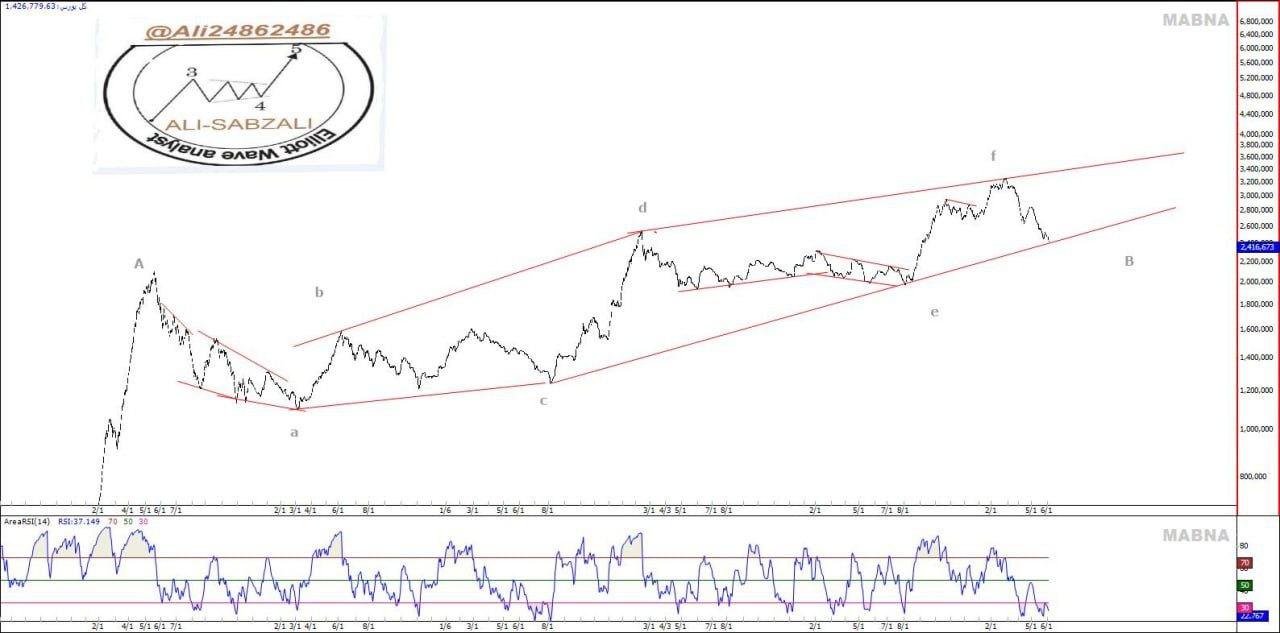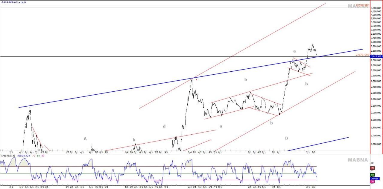 که نشان میدهد هنوز در الگوی اصلاحی و زمانبر F از دیامتریک افزایشی پیش رو هستیم که خود مثلث 5 موجی است . در موج درونی d سقف مهم ۳ میلیون و ۶۶ هزار واحد الی ۳ میلیون و ۲۰۰ هزار واحد است.
