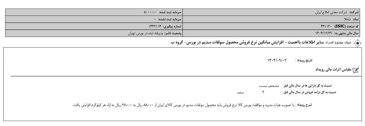 در این جلسه محمدمهدی بوربور، مدیرعامل شرکت معدنی املاح ایران پس از ارائه توضیحاتی در خصوص اقدامات صورت گرفته و اقدامات پیش روی شرکت در قالب گزارش عملکرد شش ماهه اظهار داشت: شرکت معدنی املاح ایران در شش ماهه نخست سال ۱۴۰۴ از فروش محصولات خود بیش از ۱۶،۹۰۷ میلیارد ریال درآمد کسب کرد که در مقایسه با مدت مشابه سال قبل ۳۰ درصد رشد داشته است.