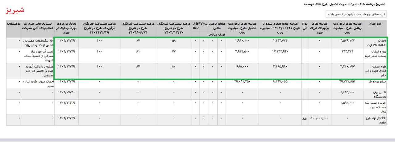 *پروژه انتقال پساب شهر تبریز ،با هزینه ی برآوردی تکمیل طرح معادل 394 میلیارد تومان که تاریخ برآوردی بهره برداری از طرح در اسفند1404 اعلام شده است.
