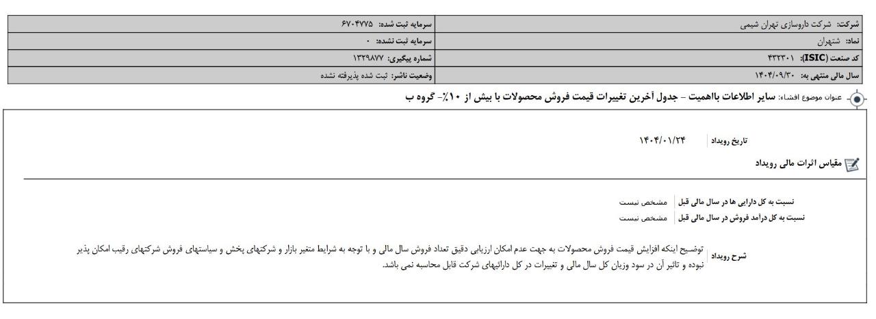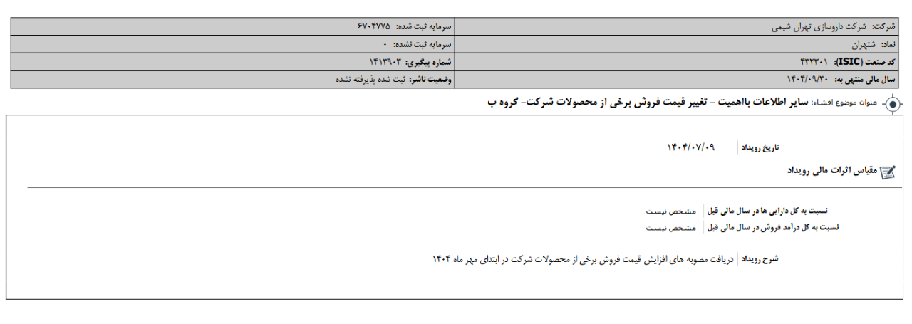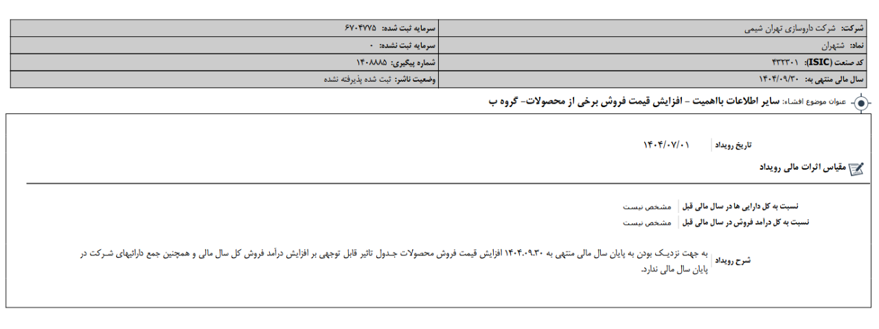 موضوع: آگهی ثبت افزایش سرمایه شرکت داروسازی تهران شیمی - نماد: شتهران