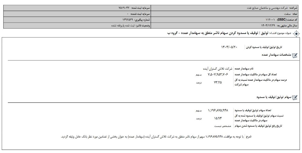 #مهندسی_و_ساختمان_صنایع_نفت ▪️ شرکت مهندسی و ساختمان صنایع نفت طی عملکرد 1 ماهه منتهی به 14040830 معادل 3,469,747 میلیون ریال، از محصولات خود را به فروش رسانده است.