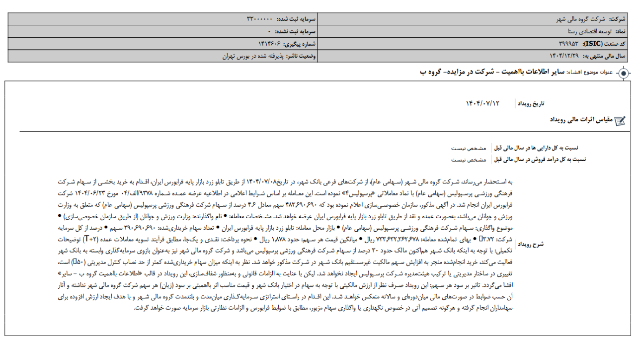پیرو اطلاعیه عرضه عمده سهام مدیریتی غیرکنترلی شرکت بیمه پردیس سهامی عام با نماد معاملاتی بپردیس4 به شماره 9394الف04 مورخ 14040625 که توسط فرابورس ایران منتشر گردید، تعداد 483,233,060 سهم معادل 16.10 درصد از سرمایه شرکت بیمه پردیس در روز چهارشنبه مورخ 14040709 از طریق بازار پایه زرد فرابورس ایران عرضه گردید. مطابق با مصوبه هیئتمدیره مورخ 14040626، شرکت گروه مالی شهر در این مزایده شرکت نمود و وفق نتایج اعلامی، به عنوان برنده معرفی و مالک 483,233,060 سهم از سهام شرکت بیمه پردیسسهامی عام به بهای تمامشده872,866,405,059 ریال گردید. اهداف این سرمایهگذاری عبارتند از: 1. تنوعبخشی به پرتفوی سرمایهگذاریهای گروه و ورود به صنعت بیمه. 2. ایجاد همافزایی میان خدمات مالی و سرمایهگذاری گروه با صنعت بیمه. 3. ارتقای جایگاه گروه مالی شهر در بازار مالی کشور. 4. کسب بازدهی و ارزشآفرینی بلندمدت متناسب با رشد صنعت بیمه. نحوه تأمین مالی: منابع این سرمایهگذاری از محل منابع داخلی شرکت تأمین شده و آثار بااهمیتی بر ساختار تعهدات مالی گروه نخواهد داشت.