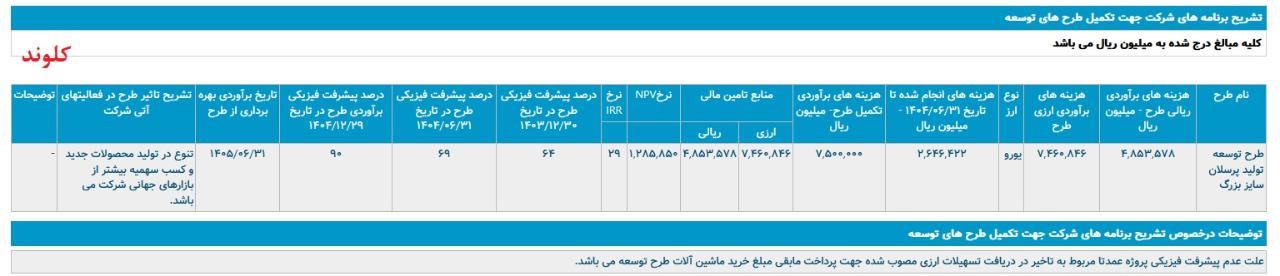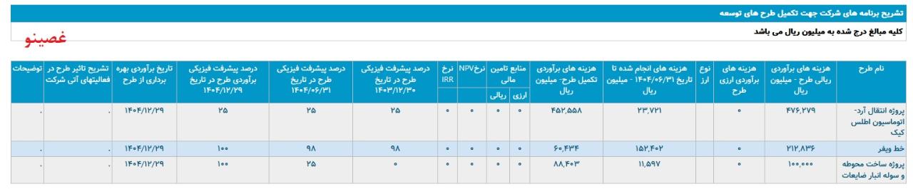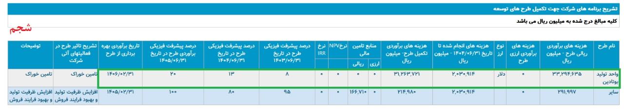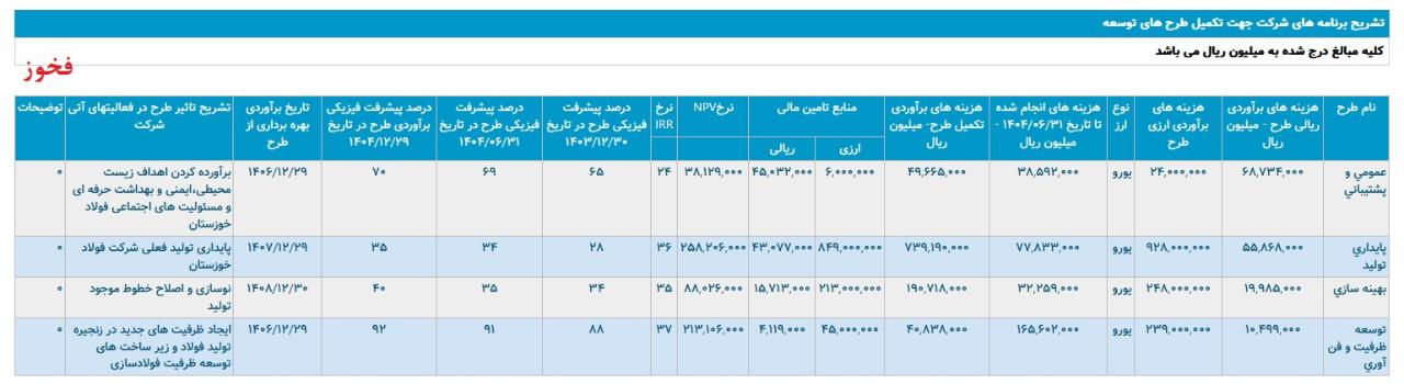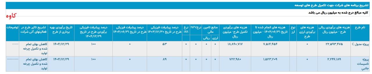 * پروژه مدول C ،با هزینه ی برآوردی تکمیل طرح معادل 1.889 میلیارد تومان که تاریخ برآوردی بهره برداری از طرح در اسفند1404 اعلام شده است.