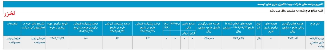 * پروژه تاسيسات جانبي ،با هزینه ی برآوردی تکمیل طرح معادل 72 میلیارد تومان که تاریخ برآوردی بهره برداری از طرح در اسفند1404 اعلام شده است.