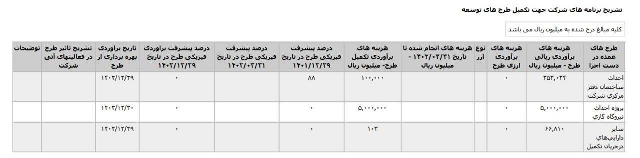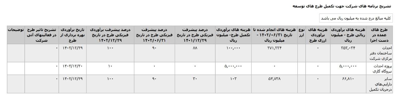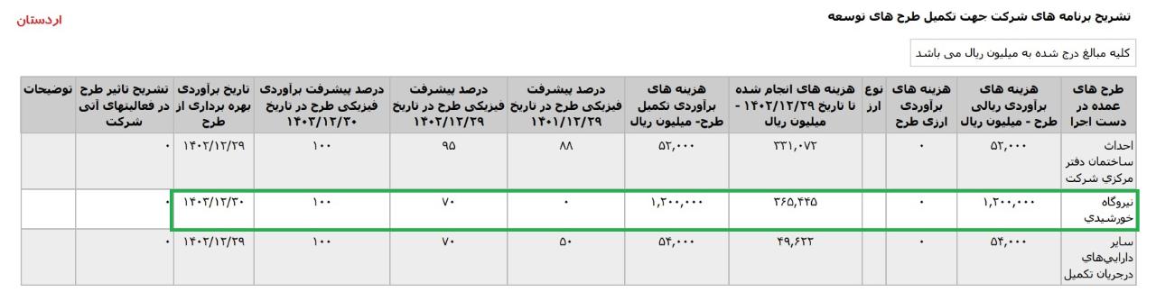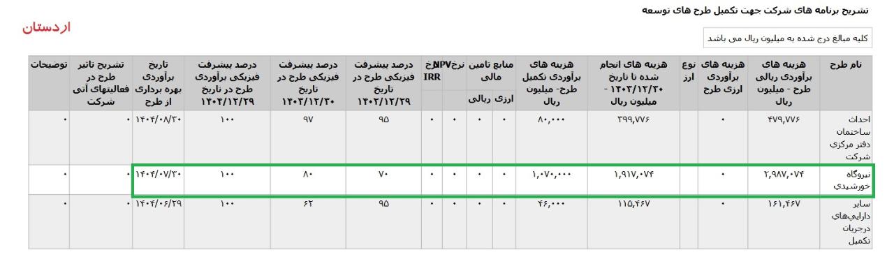*نيروگاه خورشيدي ،با هزینه ی برآوردی تکمیل طرح معادل 107 میلیارد تومان که تاریخ برآوردی بهره برداری از طرح اسفند1404 اعلام شده است.