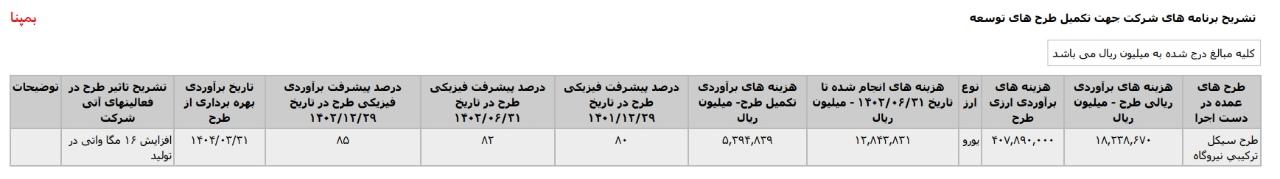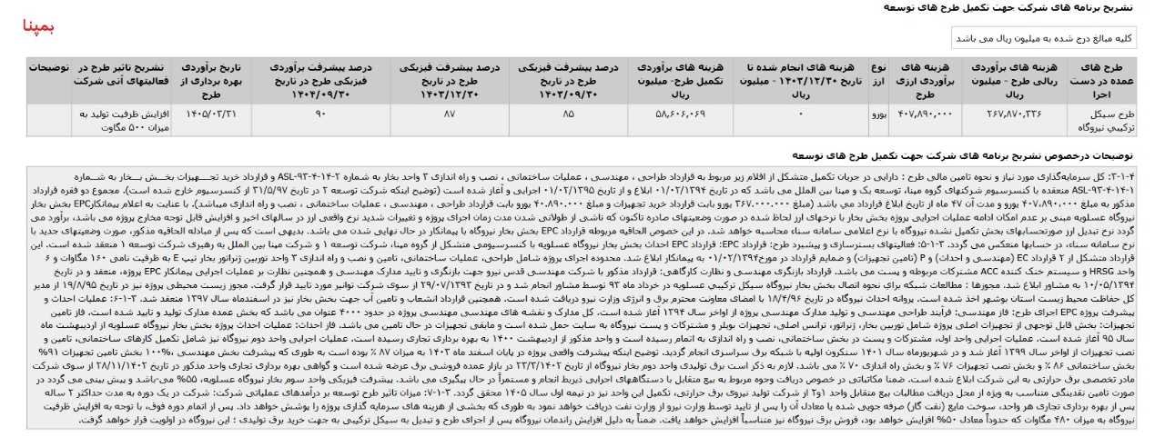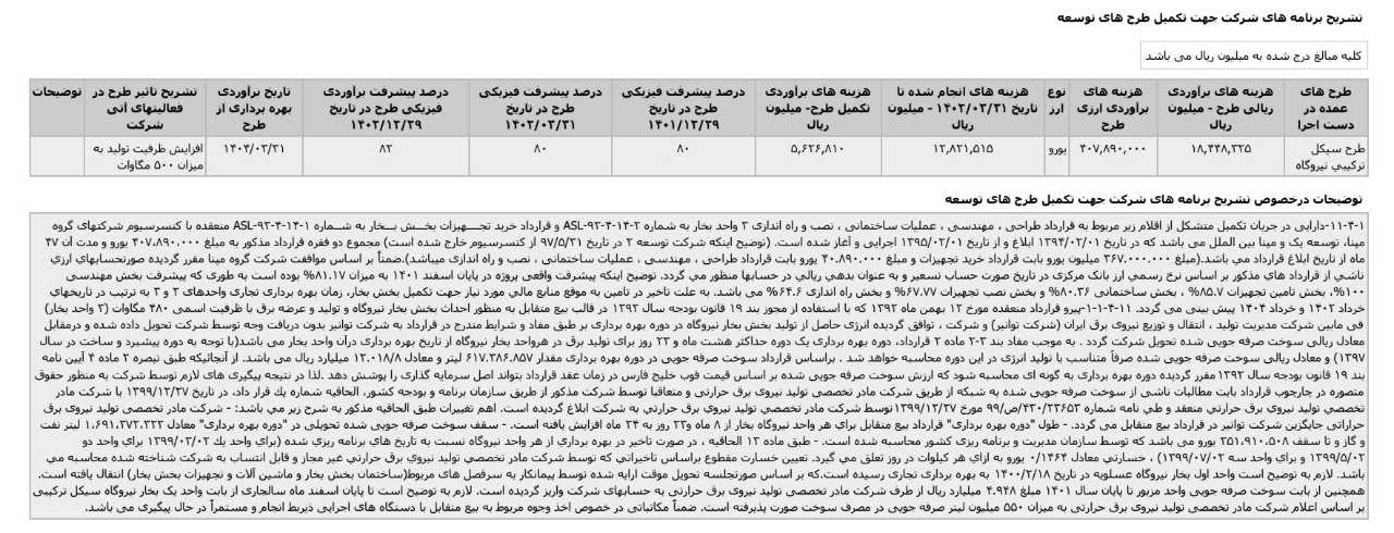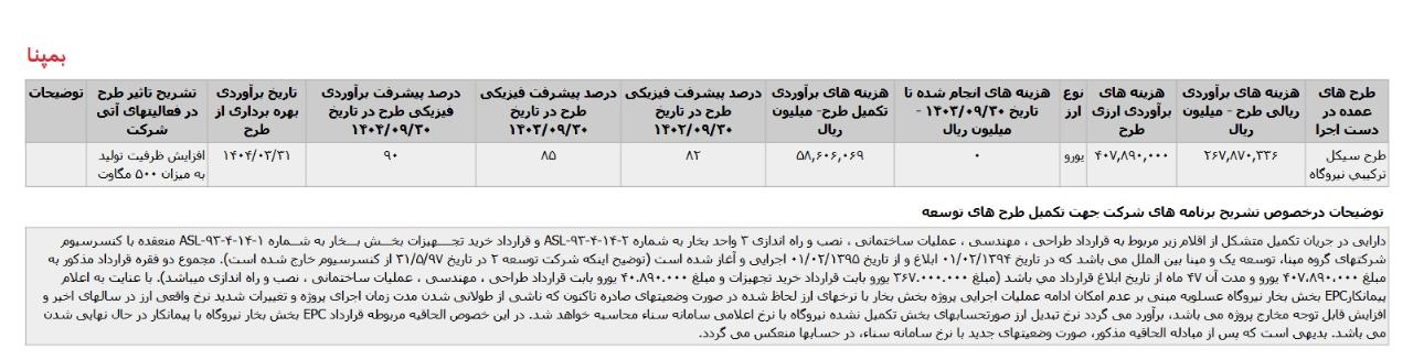 * طرح سيکل ترکيبي نيروگاه ،با هزینه ی برآوردی تکمیل طرح معادل 5.861 میلیارد تومان که تاریخ برآوردی بهره برداری از طرح در شهریور 1405 اعلام شده است.