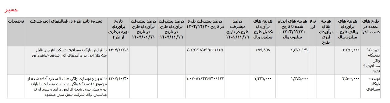 *خريد ۲۵ دستگاه واگن مسافري ۴ تخته، با هزینه ی برآوردی تکمیل طرح معادل 68 میلیارد تومان که تاریخ برآوردی بهره برداری از طرح شهریور1405 اعلام شده است.