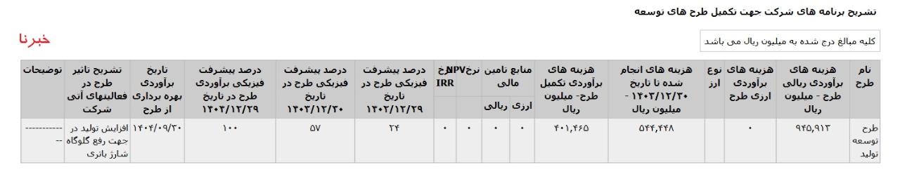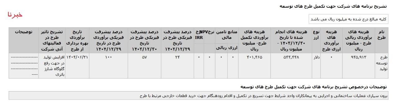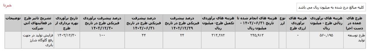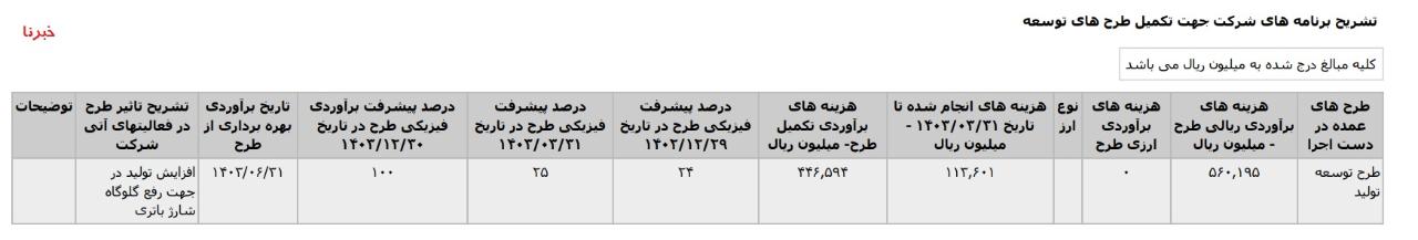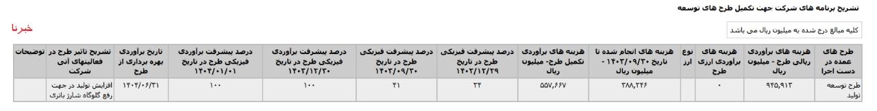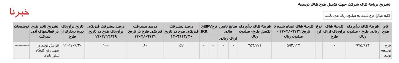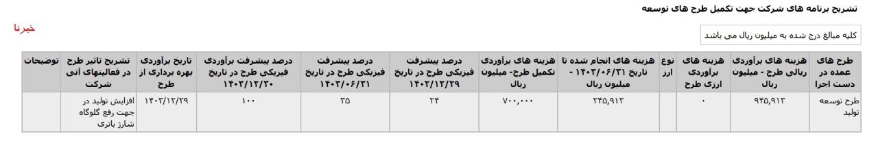 *طرح توسعه توليد ،با هزینه ی برآوردی تکمیل طرح معادل 4 میلیارد تومان که تاریخ برآوردی بهره برداری از طرح آذر 1404 اعلام شده است.