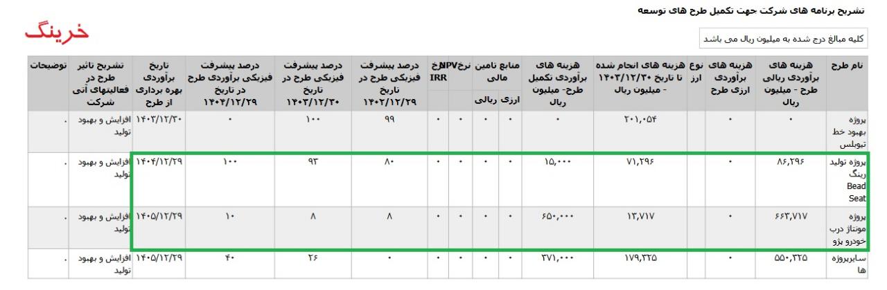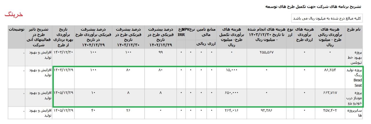 *پروژه توليد رينگ Bead Seat ،با هزینه ی برآوردی تکمیل طرح معادل 2 میلیارد تومان که تاریخ برآوردی بهره برداری از طرح اسفند 1404 اعلام شده است.