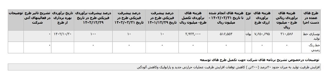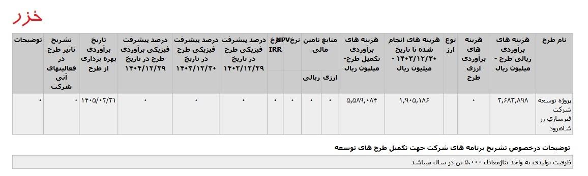* پروژه توسعه شرکت فنرسازي زر شاهرود ، با هزینه ی برآوردی تکمیل طرح معادل 166 میلیارد تومان که تاریخ برآوردی بهره برداری از طرح در اردیبهشت1405 اعلام شده است.