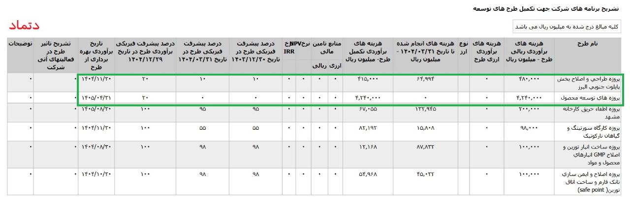 *پروژه های توسعه محصول ،با هزینه ی برآوردی تکمیل طرح معادل 424 میلیارد تومان که تاریخ برآوردی بهره برداری از طرح خرداد 1405 اعلام شده است..