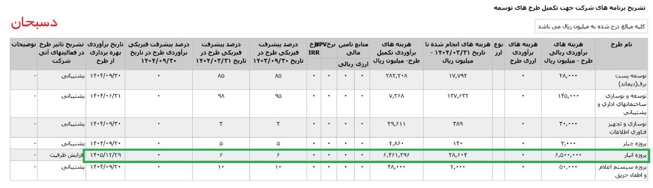 *پروژه انبار ،با هزینه ی برآوردی تکمیل طرح معادل 4 میلیارد تومان که تاریخ برآوردی بهره برداری از طرح در اسفند1405 اعلام شده است.
