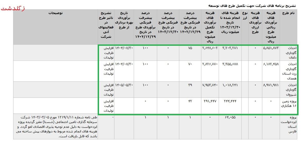 *پروژه زمين ۱۶ هکتاري ،با هزینه ی برآوردی تکمیل طرح معادل 29 میلیارد تومان که تاریخ برآوردی بهره برداری از طرح تیر1405 اعلام شده است.