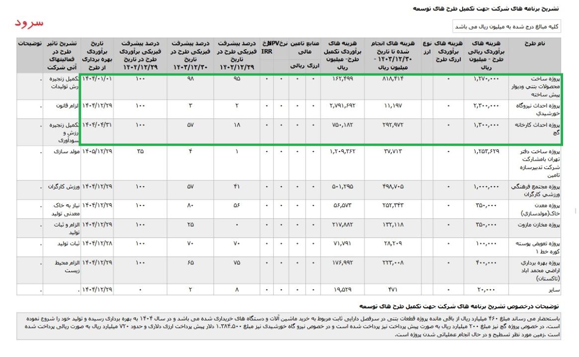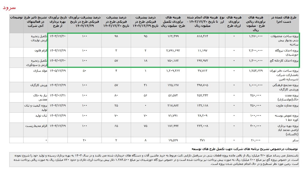 * پروژه احداث نيروگاه خورشیدی ، با هزینه ی برآوردی تکمیل طرح معادل 227 میلیارد تومان که تاریخ برآوردی بهره برداری از طرح در اسفند ماه 1404 اعلام شده است.