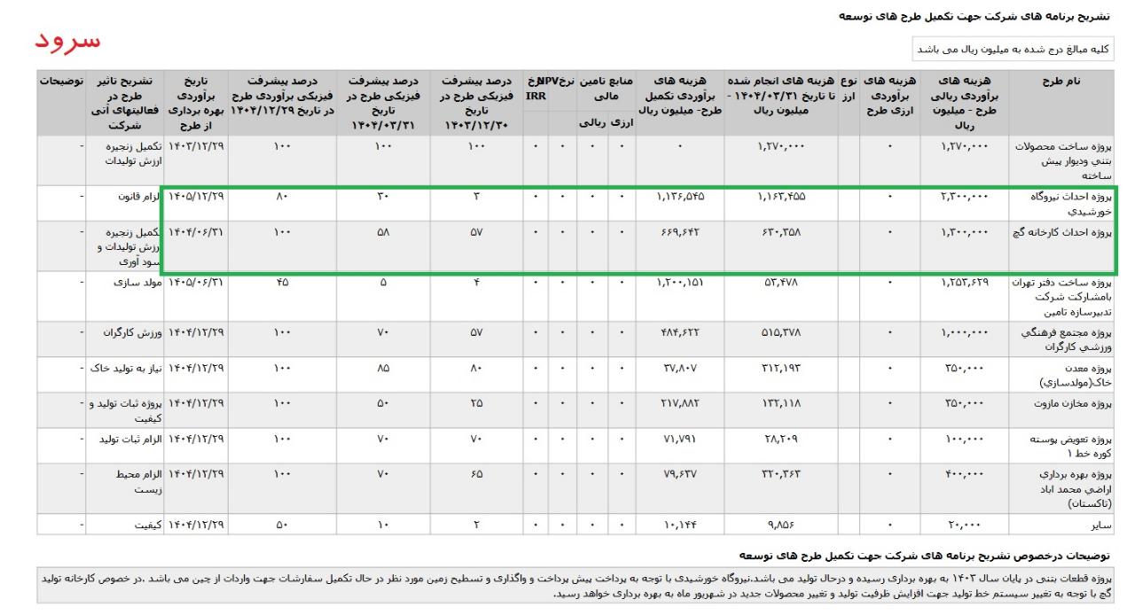 *پروژه احداث کارخانه گچ ،با هزینه ی برآوردی تکمیل طرح معادل 100 میلیارد تومان که تاریخ برآوردی بهره برداری از طرح در اسفند ماه 1404 اعلام شده است.