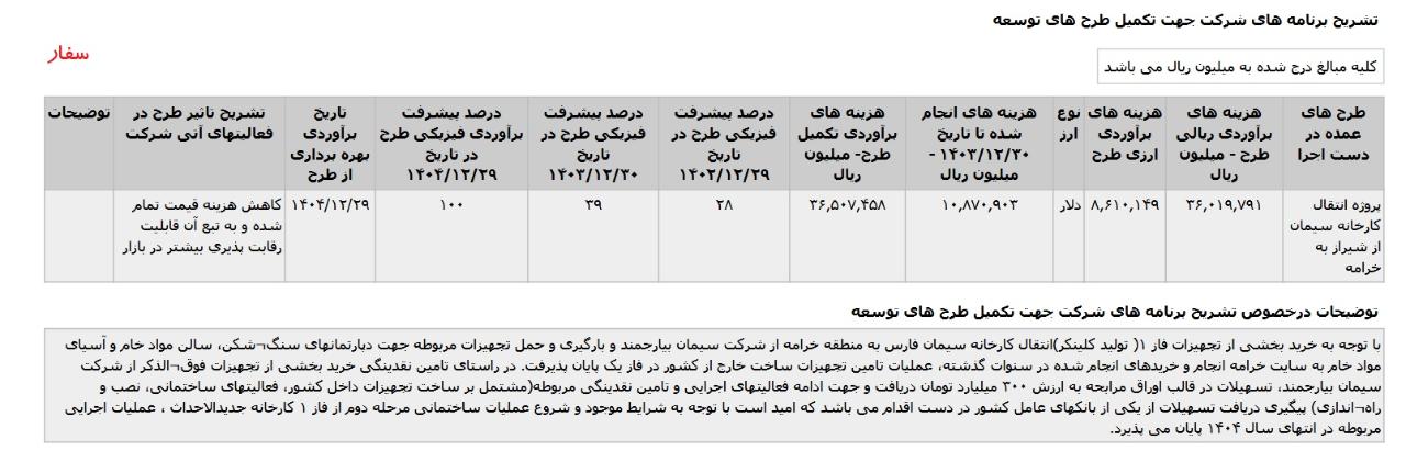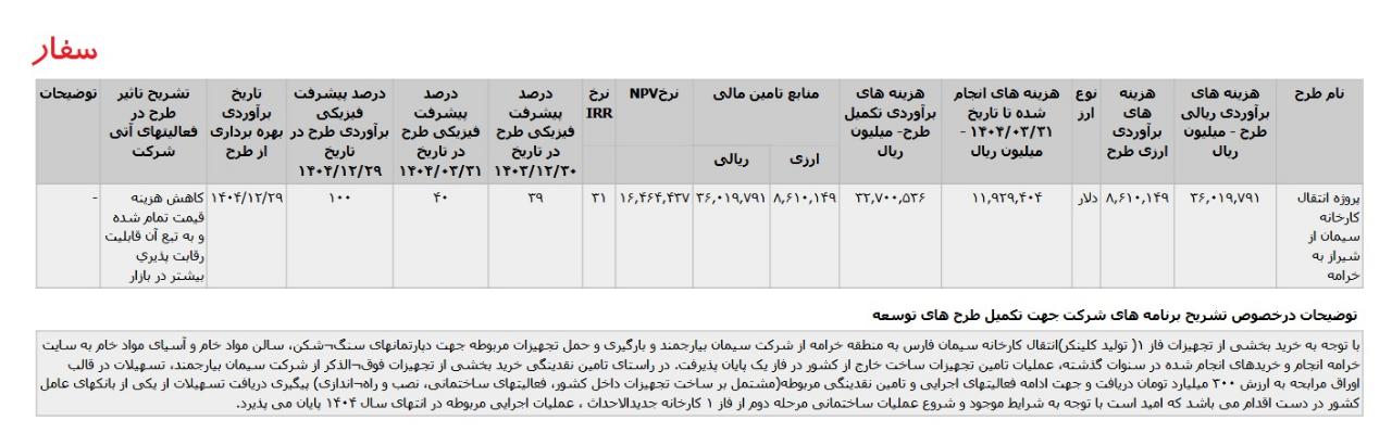 * پروژه انتقال کارخانه سيمان از شيراز به خرامه ،با هزینه ی برآوردی تکمیل طرح معادل 6.343 میلیارد تومان که تاریخ برآوردی بهره برداری از طرح در آذر1405 اعلام شده است.