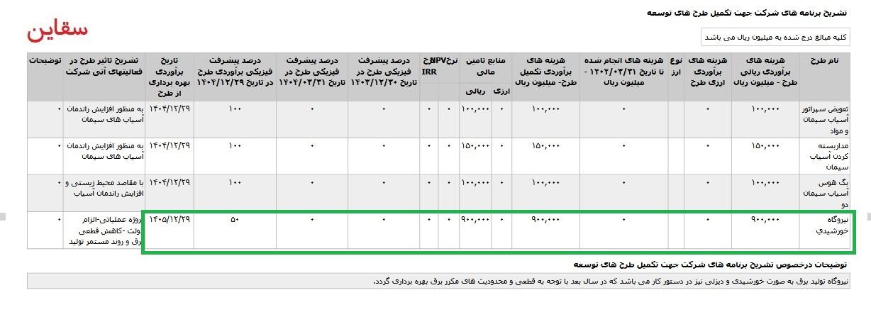 *نیروگاه خورشیدی، که هزینه برآوردی تکمیل طرح معادل 90 میلیارد تومان بوده و تاریخ برآوردی بهره برداری از طرح در اسفند1404 اعلام شده است.