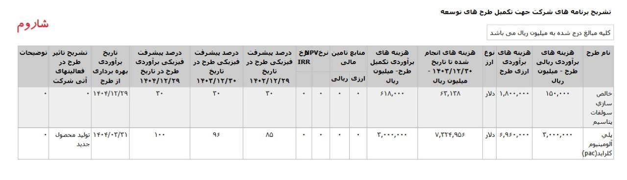 *پلي آلومينيوم کلرايدpac ، با هزینه ی برآوردی تکمیل طرح معادل 300 میلیارد تومان که تاریخ برآوردی بهره برداری از طرح اردیبهشت 1405 اعلام شده است.