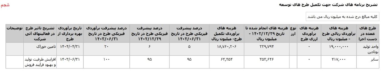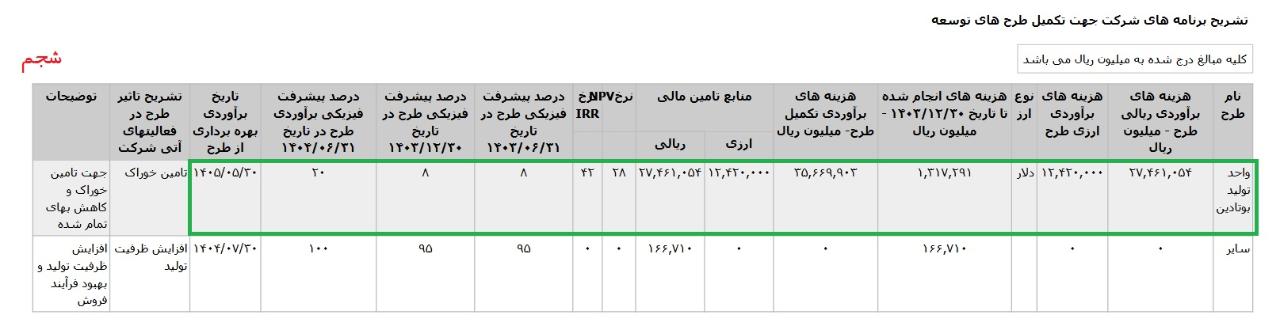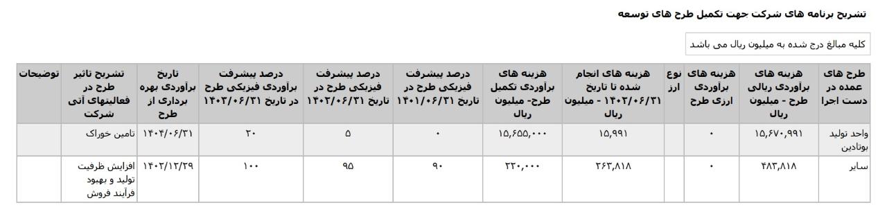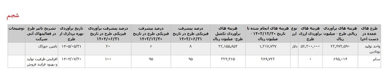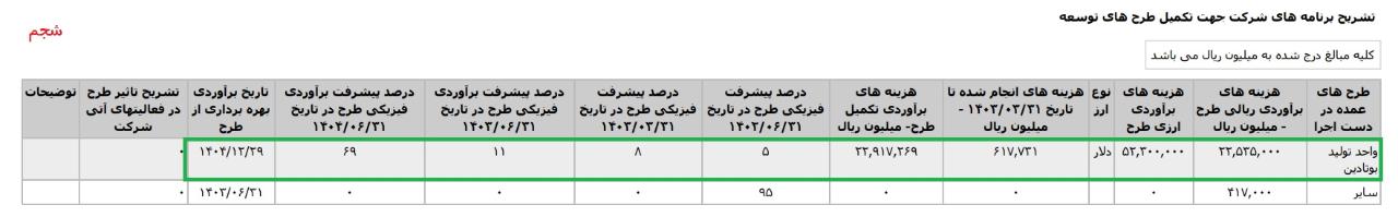* واحد توليد بوتادين،با هزینه ی برآوردی تکمیل طرح معادل 2.2063.126 میلیارد تومان که تاریخ برآوردی بهره برداری از طرح در اردیبهشت1406 اعلام شده است.