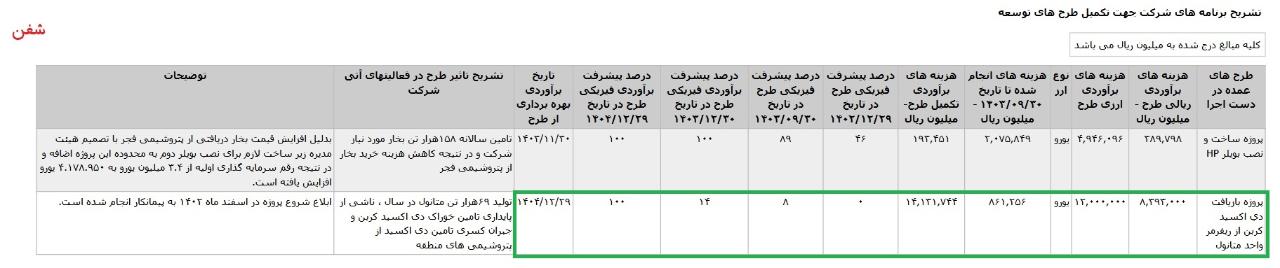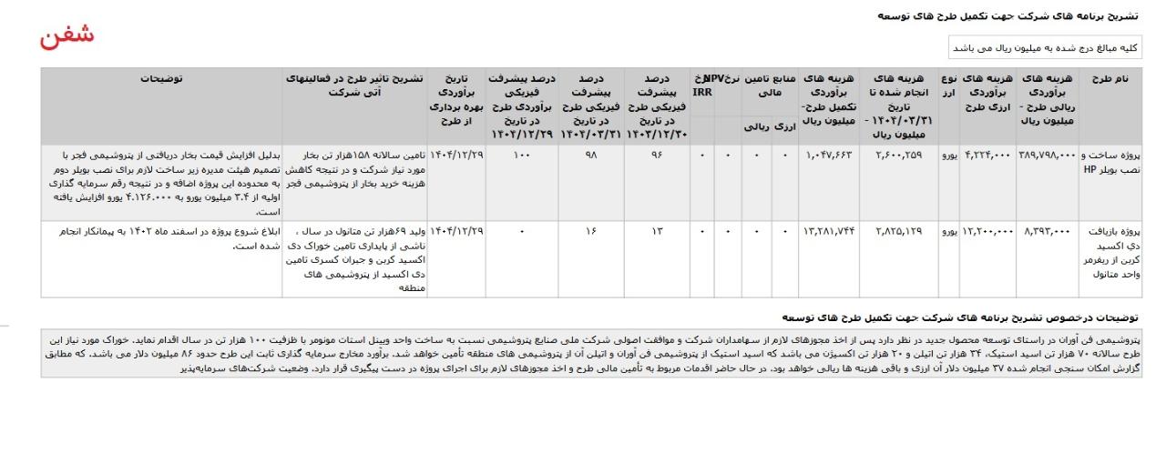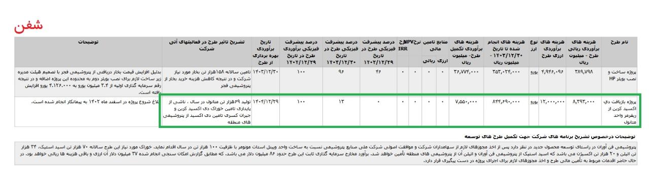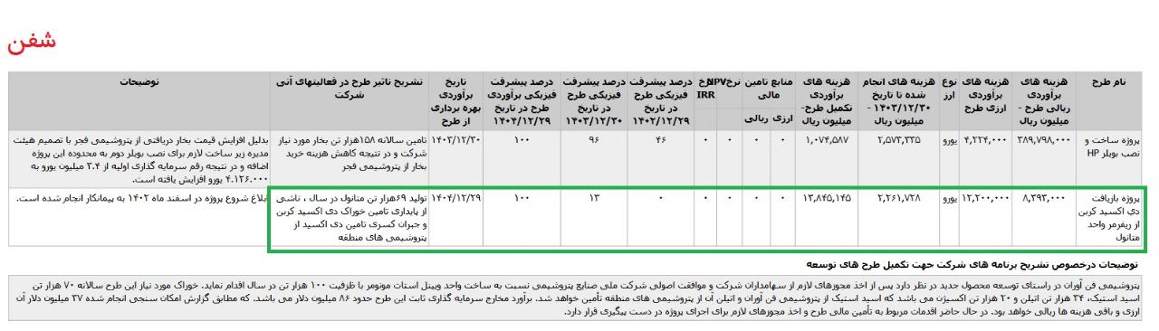 * * پروژه بازيافت دي اکسيد کربن از ريفرمر واحد متانول، با هزینه ی برآوردی تکمیل طرح معادل 1.328 میلیارد تومان که تاریخ برآوردی بهره برداری از طرح فروردین 1405 اعلام شده است.