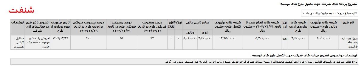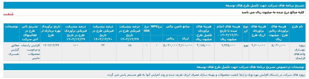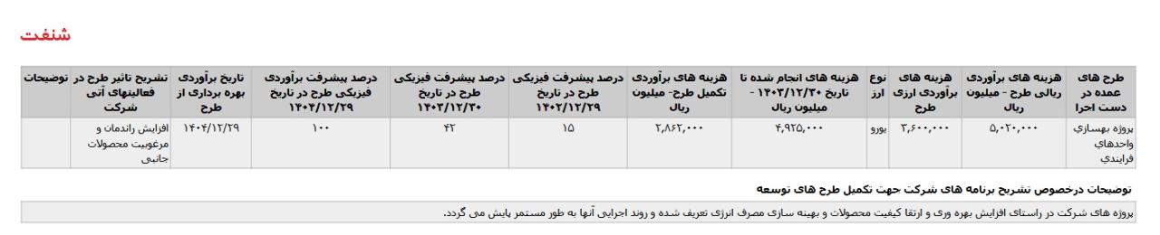 * پروژه بهسازي واحدهاي فرايندي ،با هزینه ی برآوردی تکمیل طرح معادل 394 میلیارد تومان که تاریخ برآوردی بهره برداری از طرح در اردیبهشت1405 اعلام شده است.