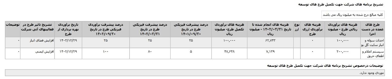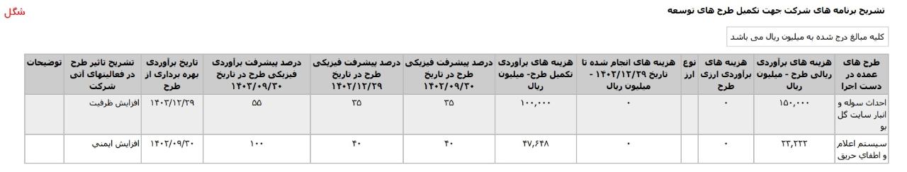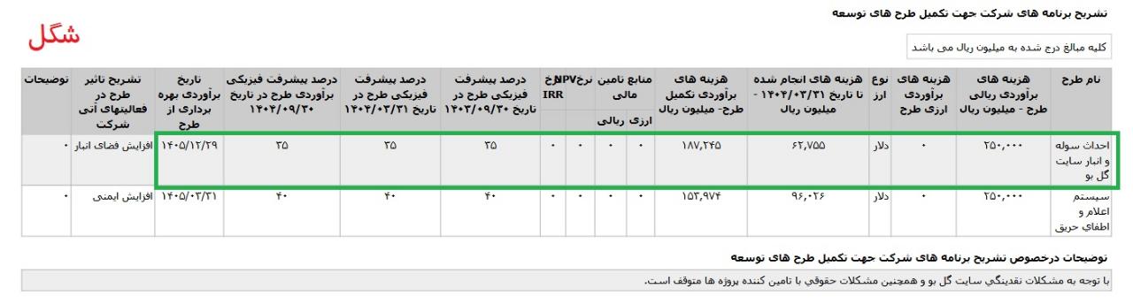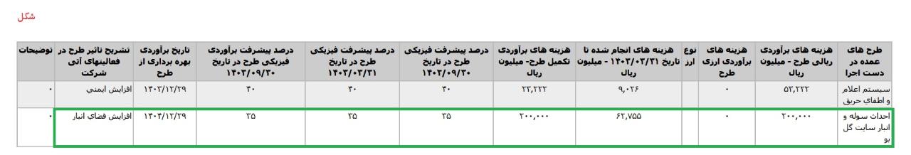 * احداث سوله و انبار سايت گل بو ،با هزینه ی برآوردی تکمیل طرح معادل 19 میلیارد تومان که تاریخ برآوردی بهره برداری از طرح در اسفند1405 اعلام شده است.