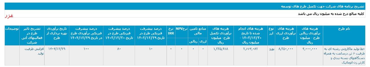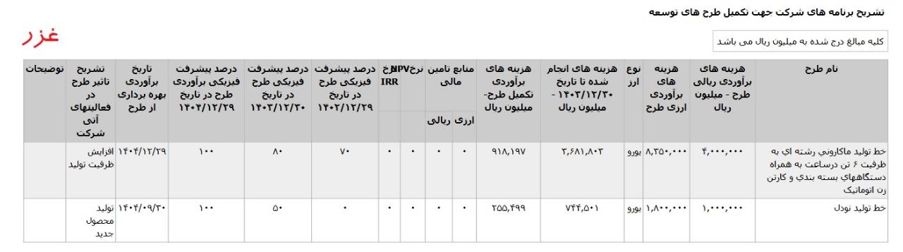 *خط تولید نودل، با هزینه ی برآوردی تکمیل طرح معادل 15 میلیارد تومان که تاریخ برآوردی بهره برداری از طرح اسفند1404 اعلام شده است.