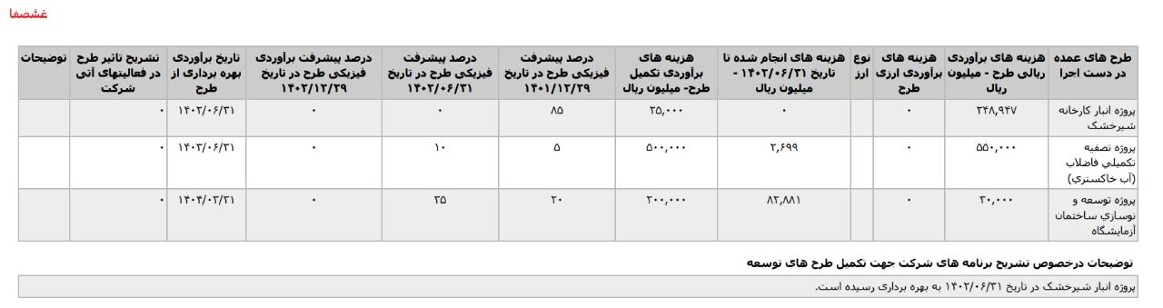 *پروژه پالایشگاه آب پنیر، با هزینه ی برآوردی تکمیل طرح معادل 500 میلیارد تومان که تاریخ برآوردی بهره برداری از طرح اسفند1405 اعلام شده است.