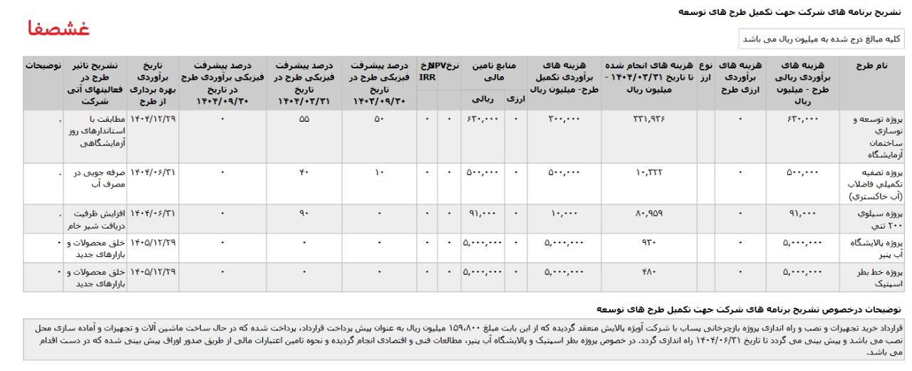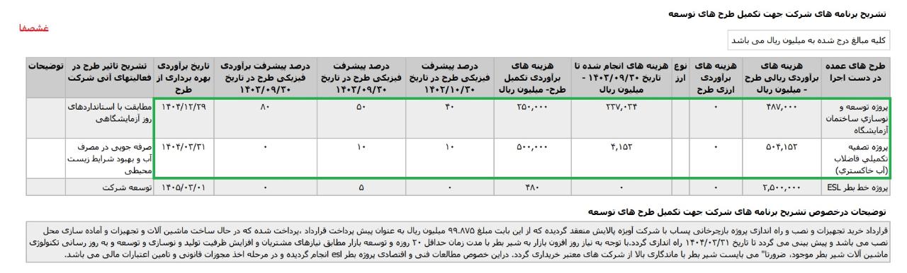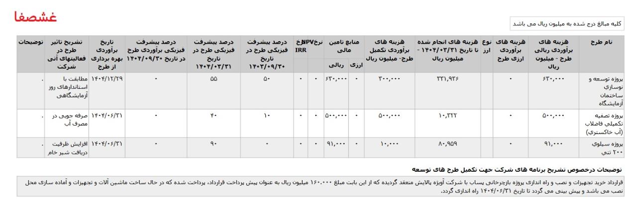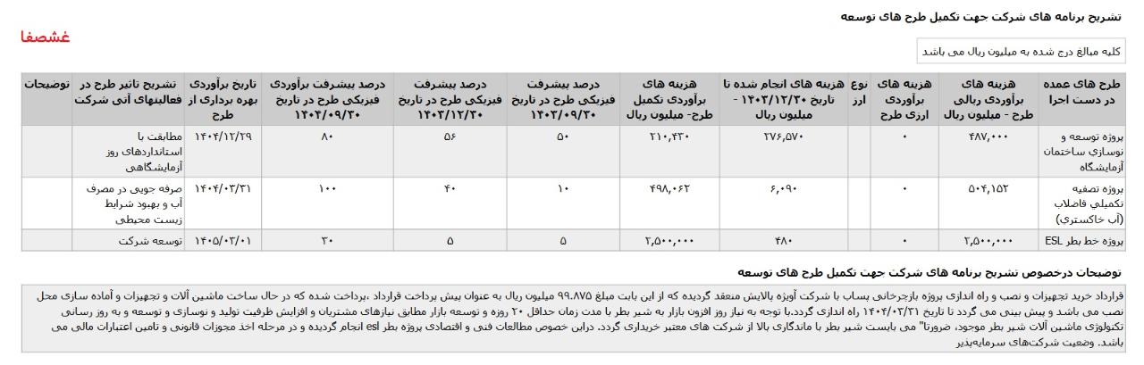 * پروژه خط بطر اسپتیک، با هزینه ی برآوردی تکمیل طرح معادل 500 میلیارد تومان که تاریخ برآوردی بهره برداری از طرح اسفند1405 اعلام شده است.