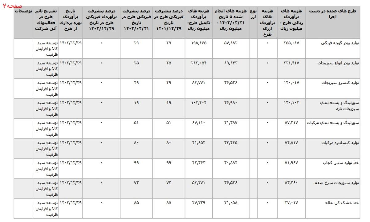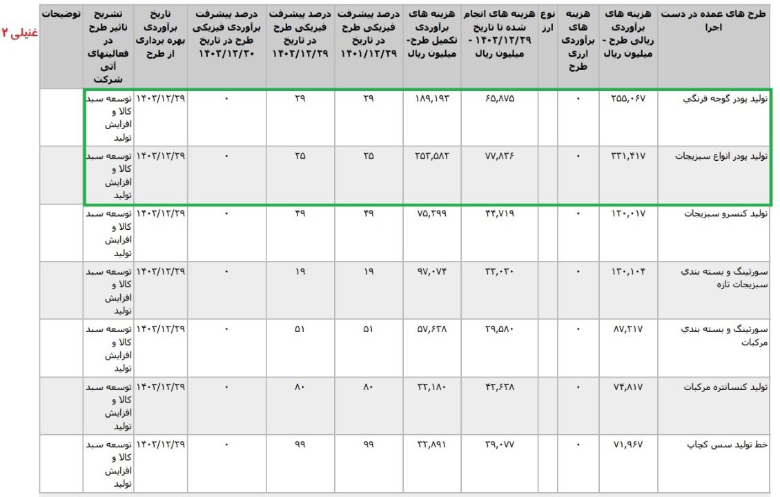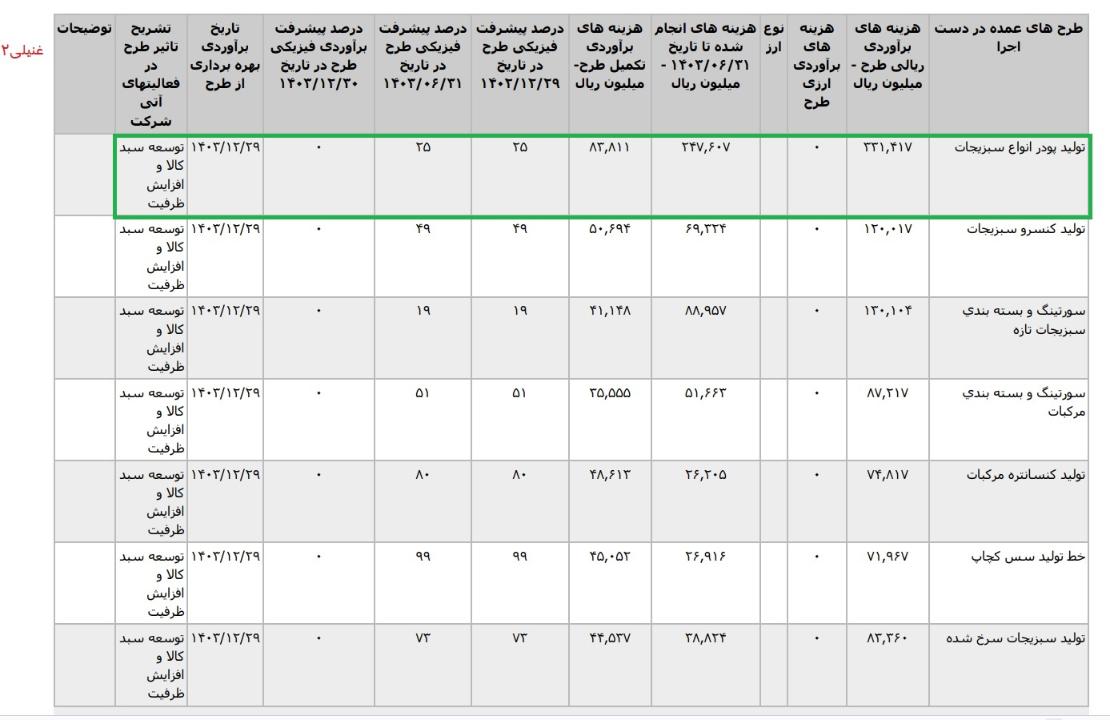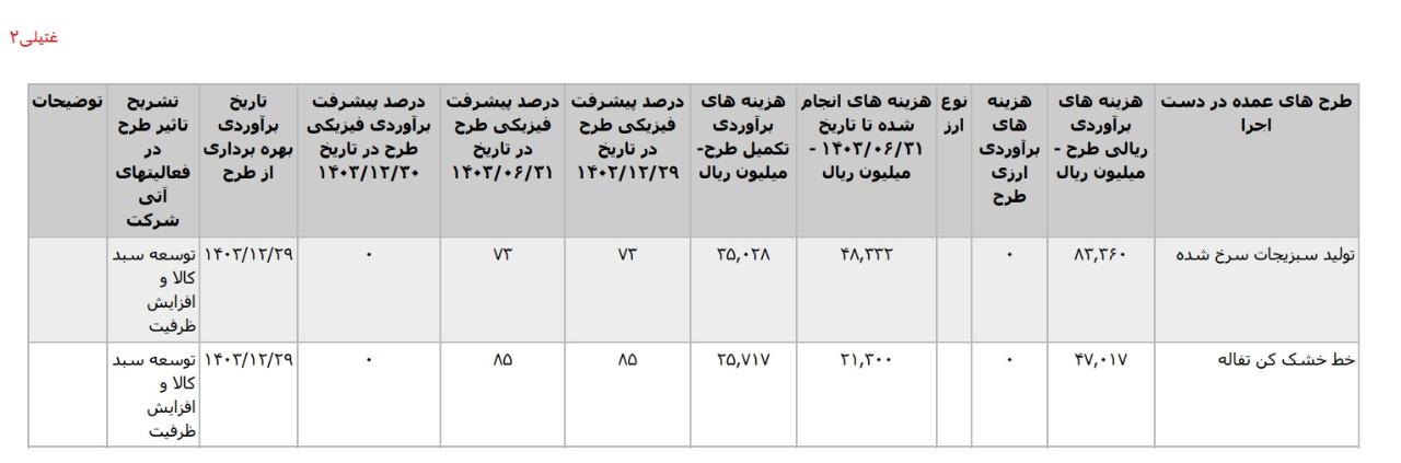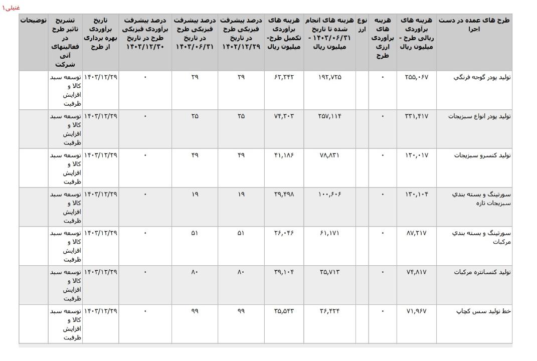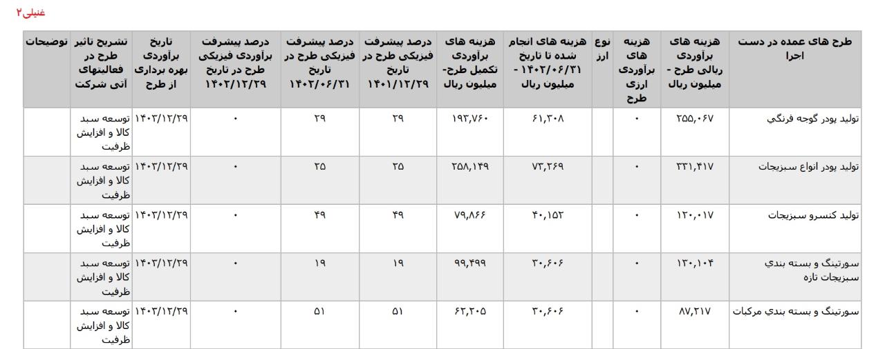 * سورتينگ و بسته بندي سبزيجات تازه، با هزینه ی برآوردی تکمیل طرح معادل 17 میلیارد تومان که تاریخ برآوردی بهره برداری از طرح اسفند1404 اعلام شده است.