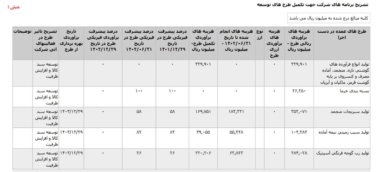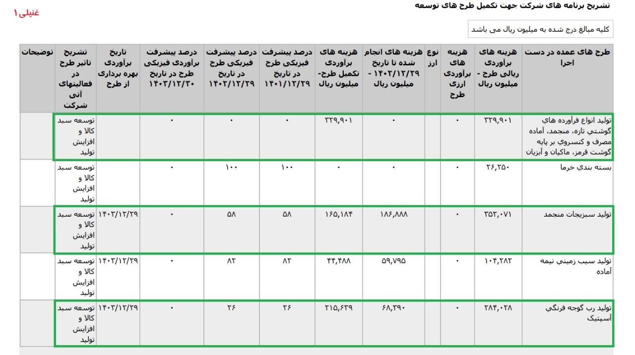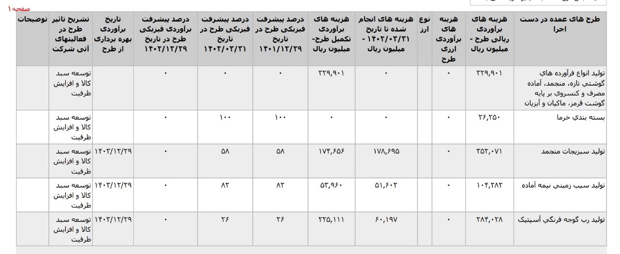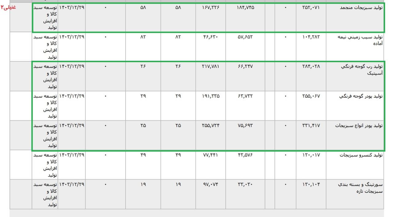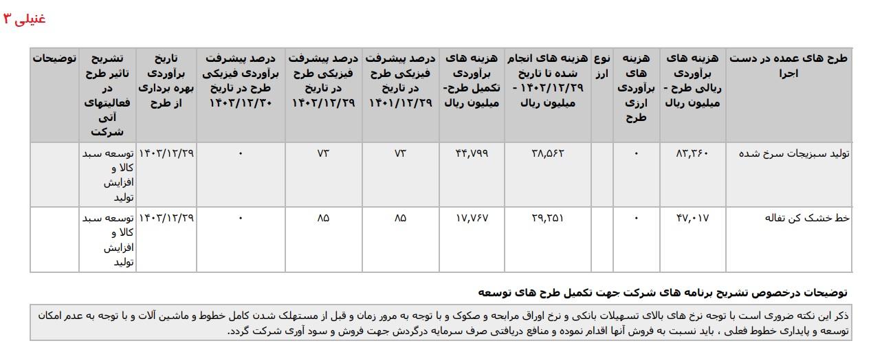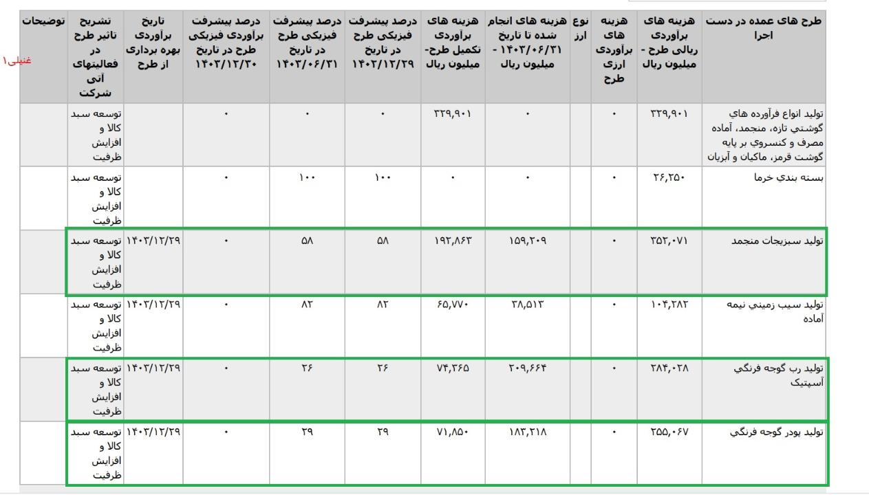 * سورتينگ و بسته بندي سبزيجات تازه، با هزینه ی برآوردی تکمیل طرح معادل 17 میلیارد تومان که تاریخ برآوردی بهره برداری از طرح اسفند1404 اعلام شده است.