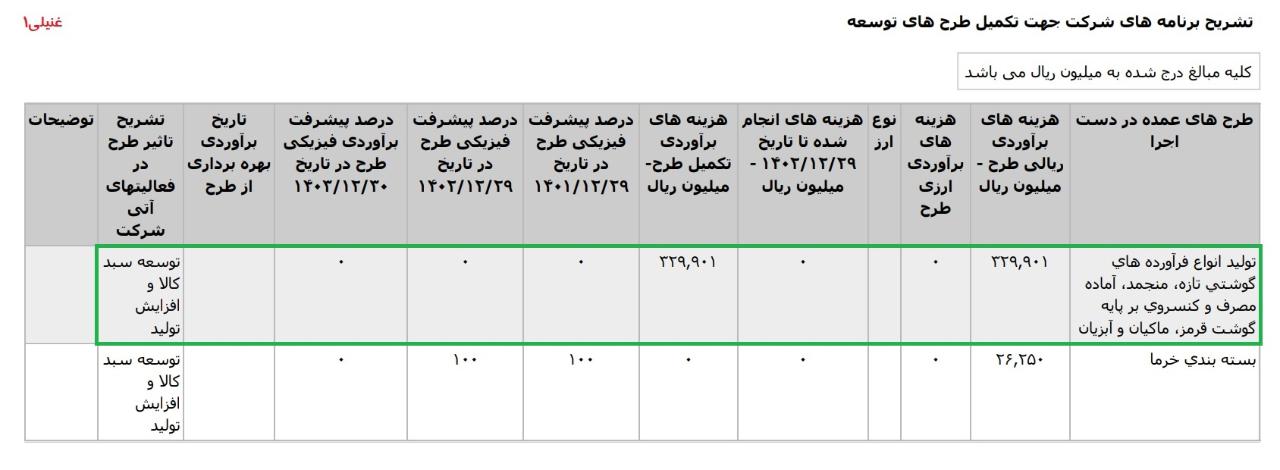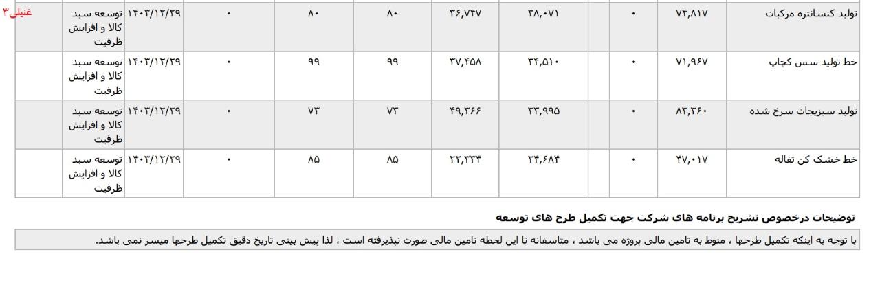 *تولید کنسرو سبزیجات،با هزینه ی برآوردی تکمیل طرح معادل 12 میلیارد تومان که تاریخ برآوردی بهره برداری از طرح اسفند1404 اعلام شده است.