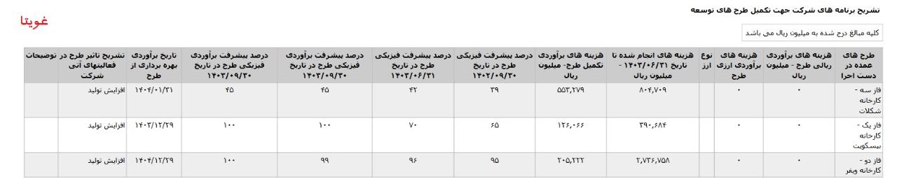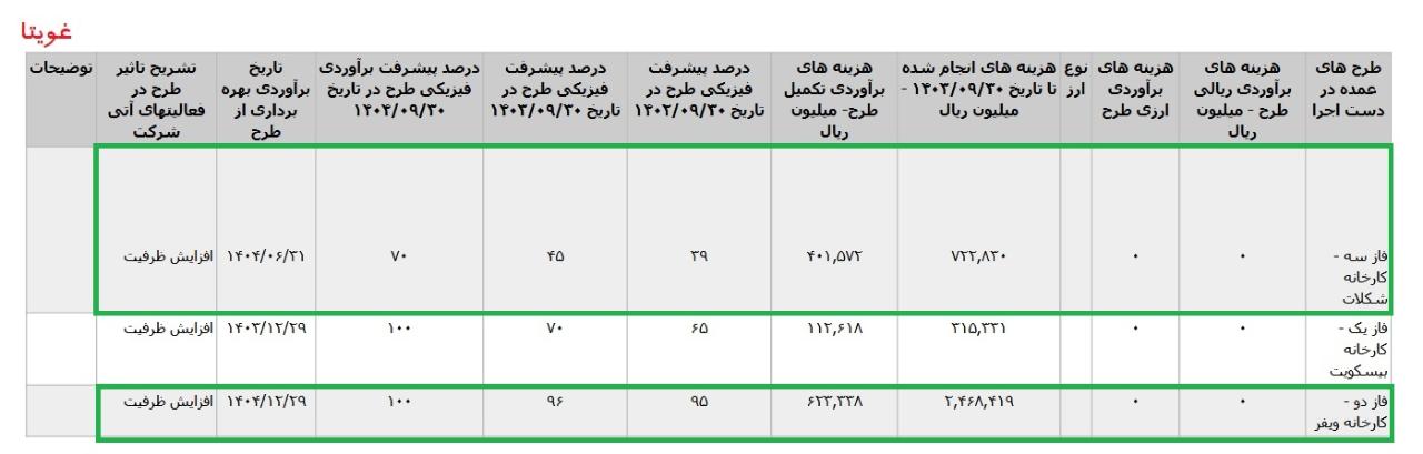 *فااز دو - کارخانه ويفر ،با هزینه ی برآوردی تکمیل طرح معادل 62 میلیارد تومان که تاریخ برآوردی بهره برداری از طرح در آبان1405 اعلام شده است.