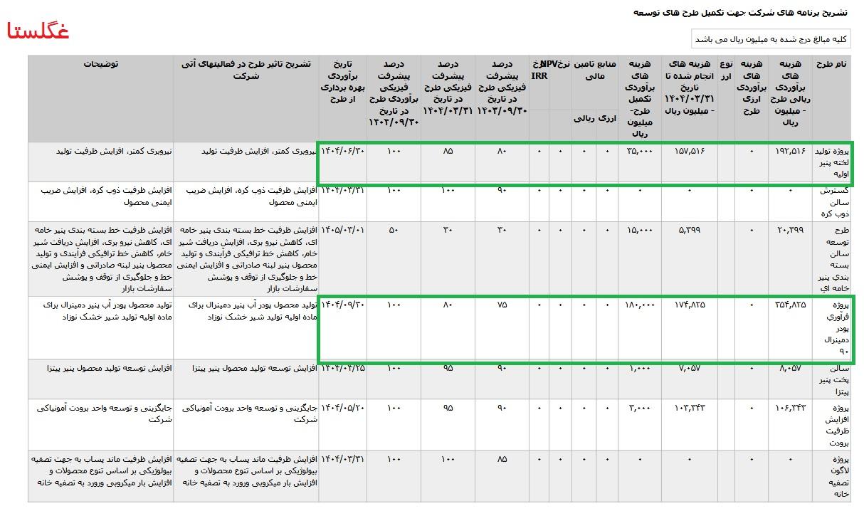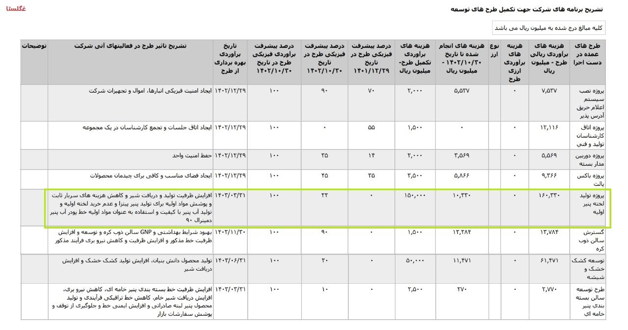 *پروژه توليد لخته پنير اوليه ،با هزینه ی برآوردی تکمیل طرح معادل 3 میلیارد تومان که تاریخ برآوردی بهره برداری از طرح آبان1404 اعلام شده است.
