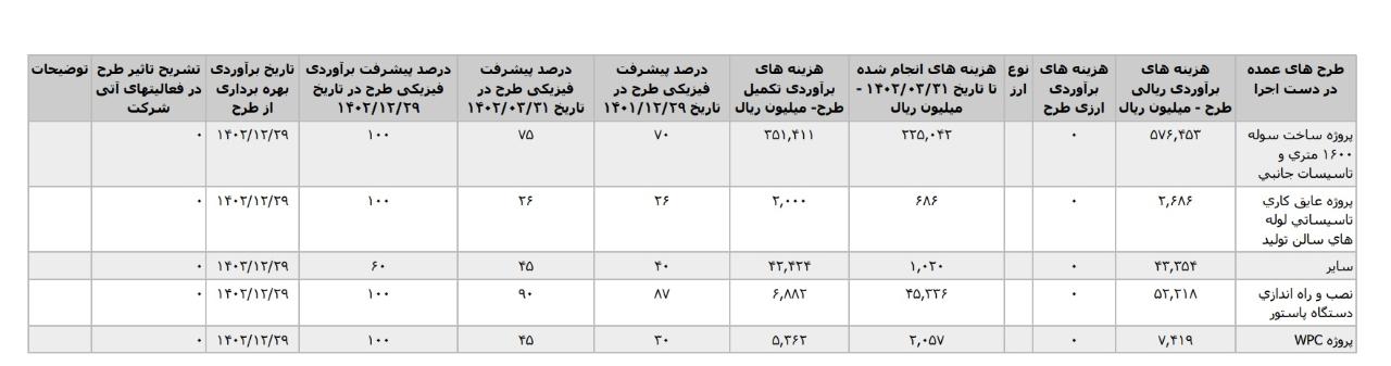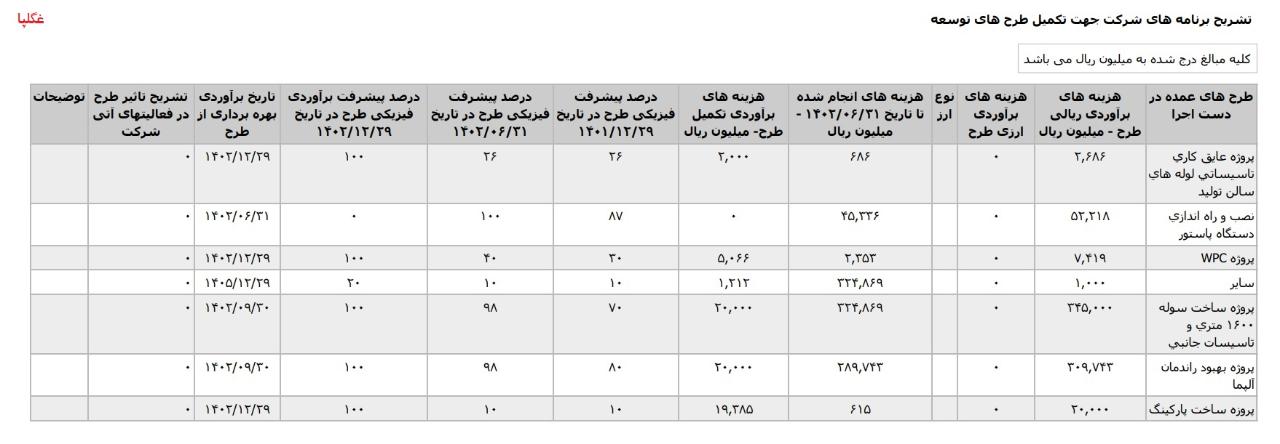 *پروژه اصلاح واحد پودری ،با هزینه ی برآوردی تکمیل طرح معادل 20 میلیارد تومان که تاریخ برآوردی بهره برداری از طرح آذر ماه 1405 اعلام شده است.