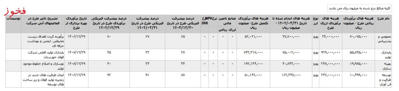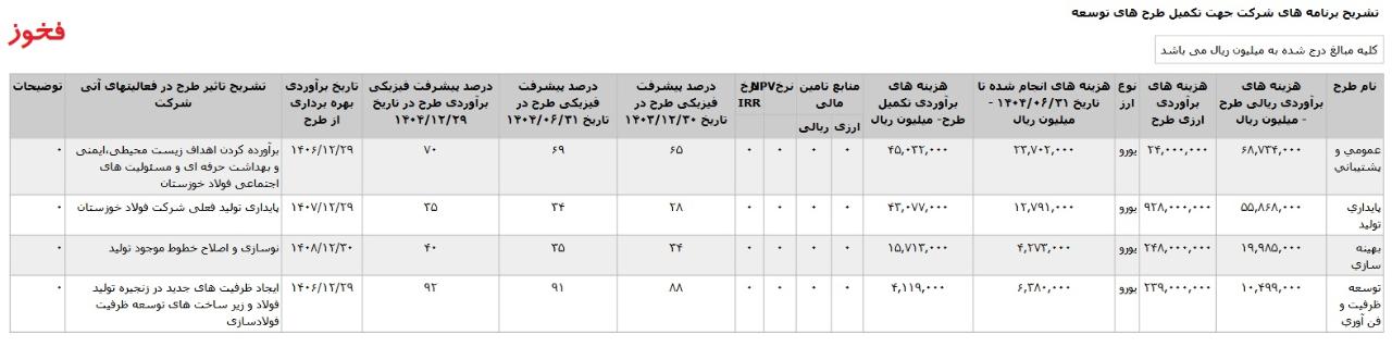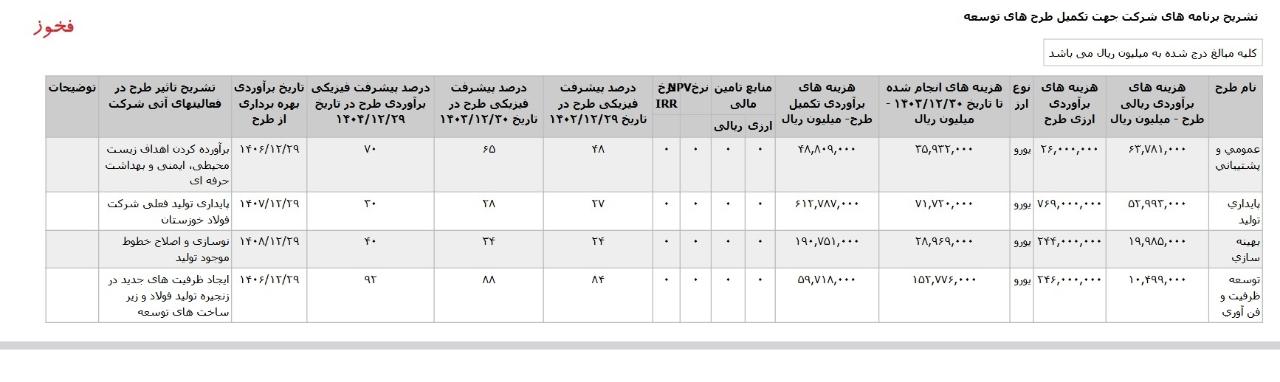 *توسعه ظرفيت و فن آوري ،با هزینه ی برآوردی تکمیل طرح معادل 4.084 میلیارد تومان که تاریخ برآوردی بهره برداری از طرح اسفند 1406 اعلام شده است.