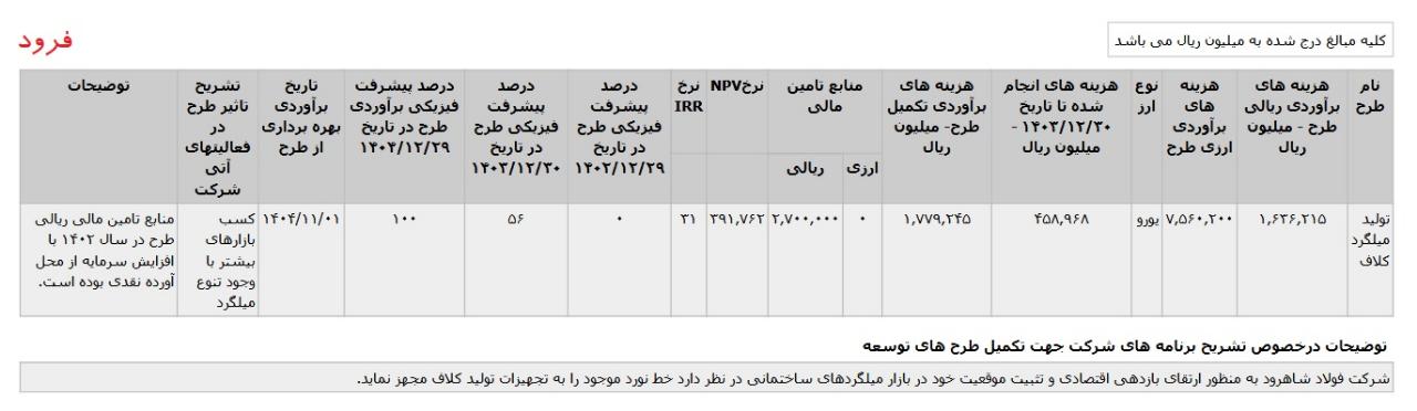 * توليد ميلگرد کلاف ،با هزینه ی برآوردی تکمیل طرح معادل 173 میلیارد تومان که تاریخ برآوردی بهره برداری از طرح در مرداد1405 اعلام شده است.